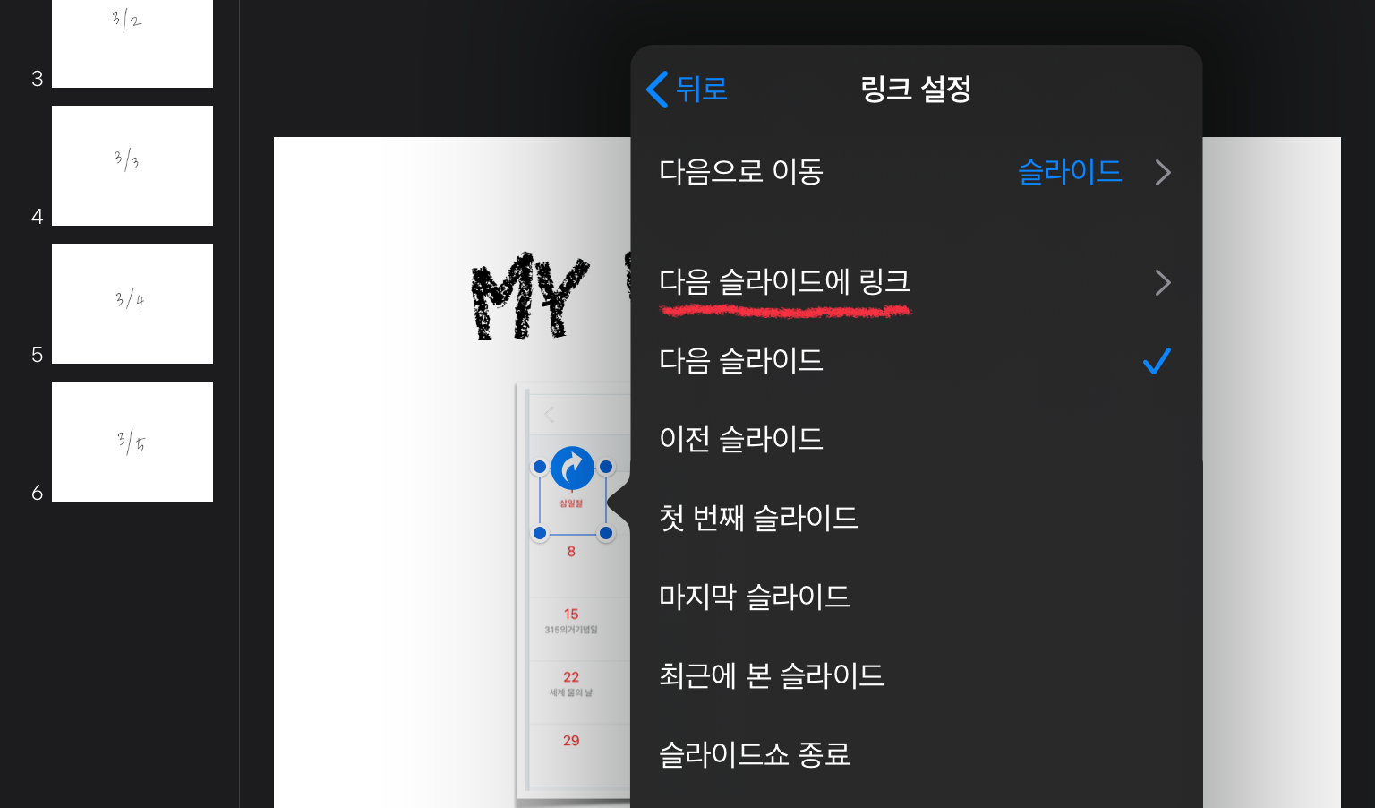 3/1을 클릭하면, 3/1에 해당하는 2번 페이지로 이동하겠다고 지정을 해주는 일입니다. 3/1페이지는 2페이지에 있기 때문에 2번을 눌러줍니다. 슬라이드는 생성된 슬라이드만큼 나타납니다.