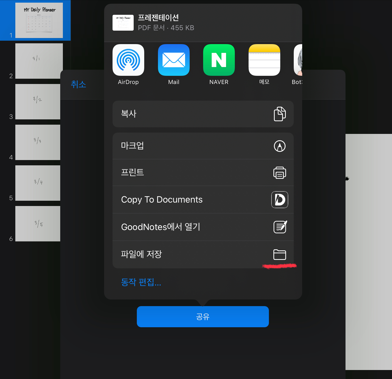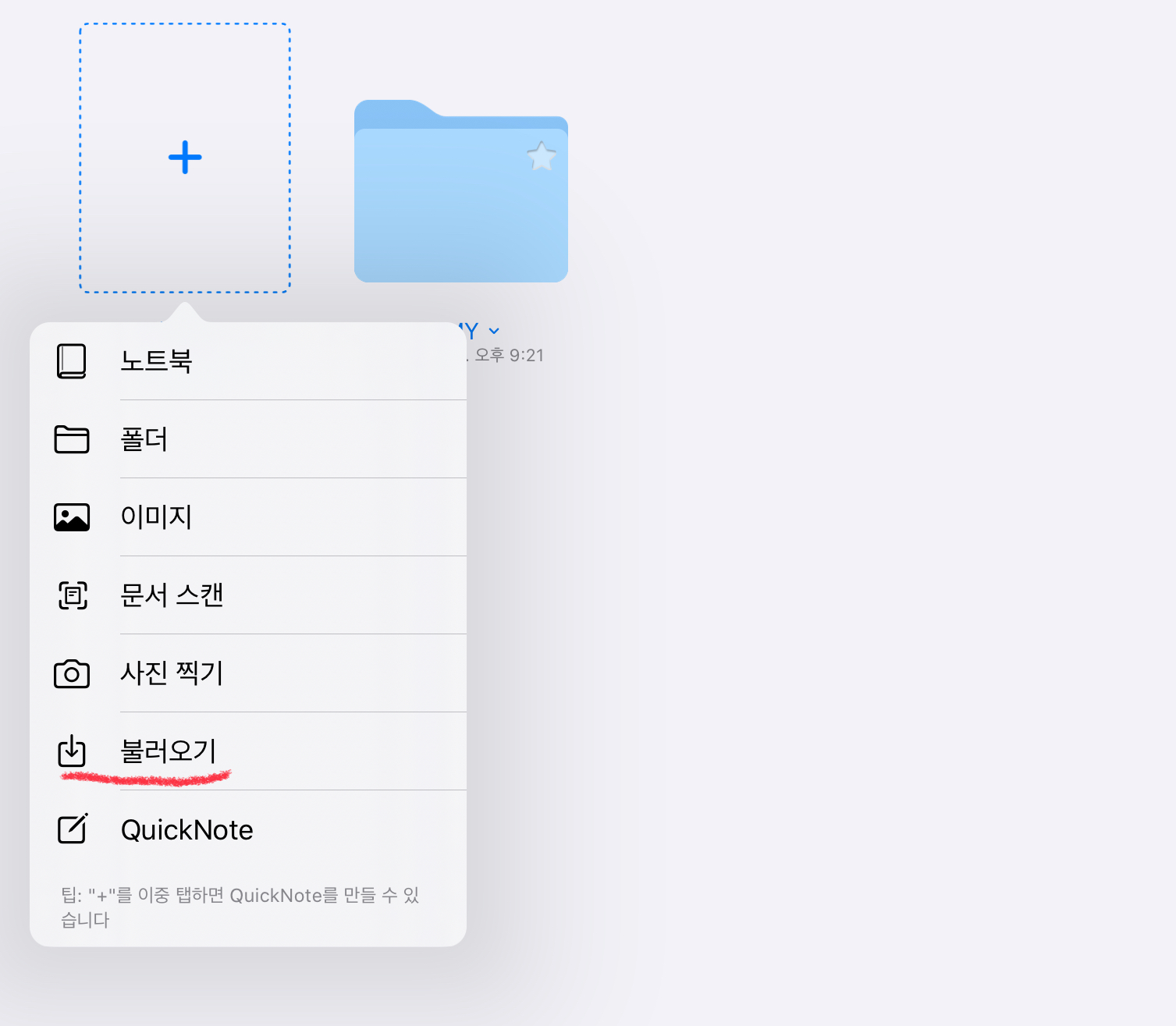 이때 굿노트에서 바로 열어도 되지만, 저는 파일에 저장을 해주었습니다. 그리고 굿노트로 이동한 후에, 아래와 같이 [새문서] - [불러오기]를 이용하여 좀 전에 만들어주었던 파일을 열어주면 됩니다.