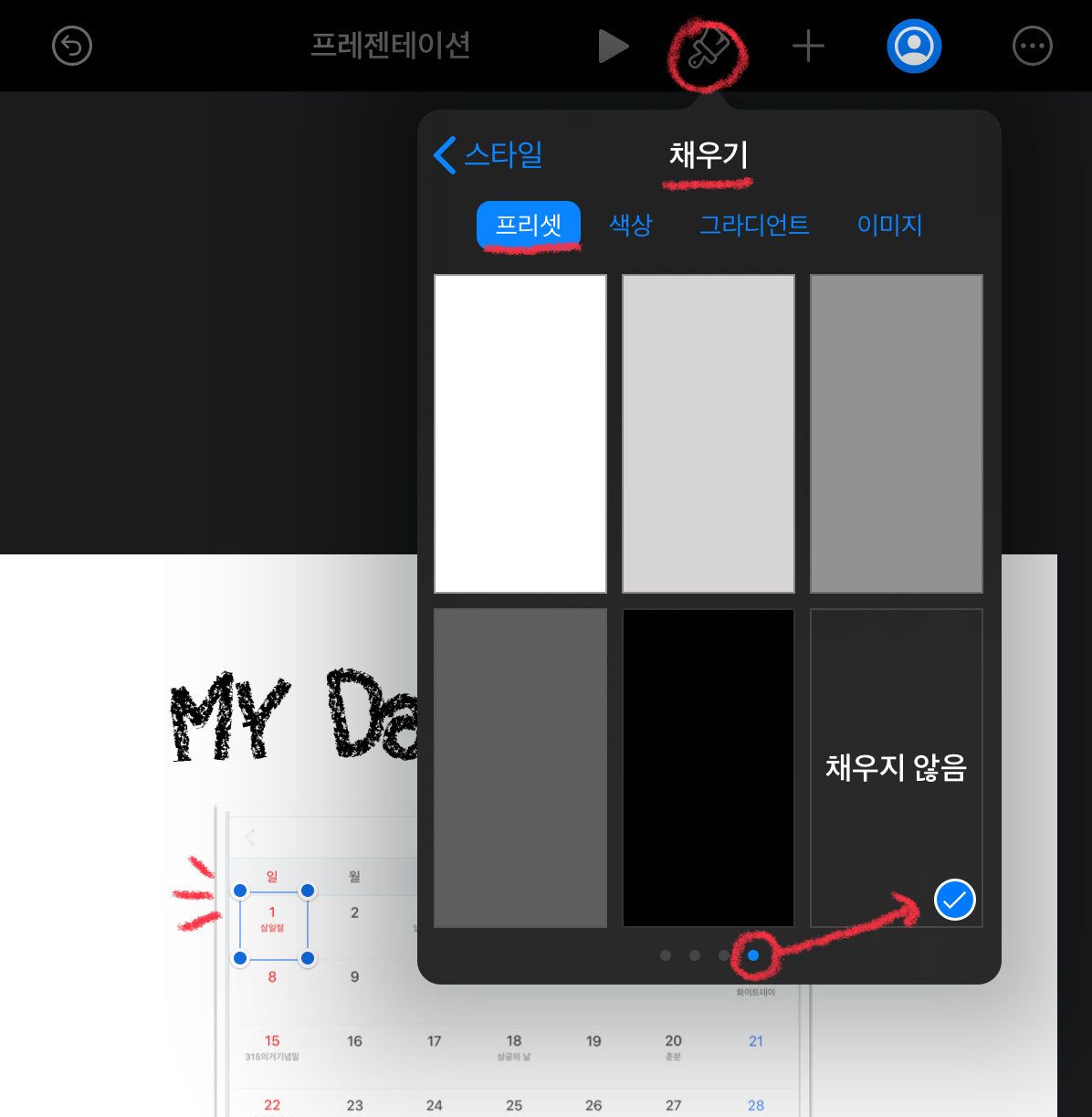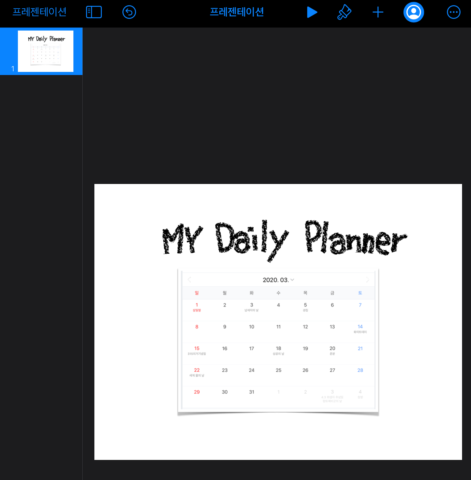 빈 화면에 여러분들이 하이퍼 링크를 넣어줄 화면을 만들어줍니다. 이때 가지고 있는 서식을 이용하시면 됩니다. 혹은 굿노트 안에 기본 서식을 PDF로 내보낸 후에 키노트로 불러와도 됩니다. 이 내용은 따로 올리도록 하겠습니다.