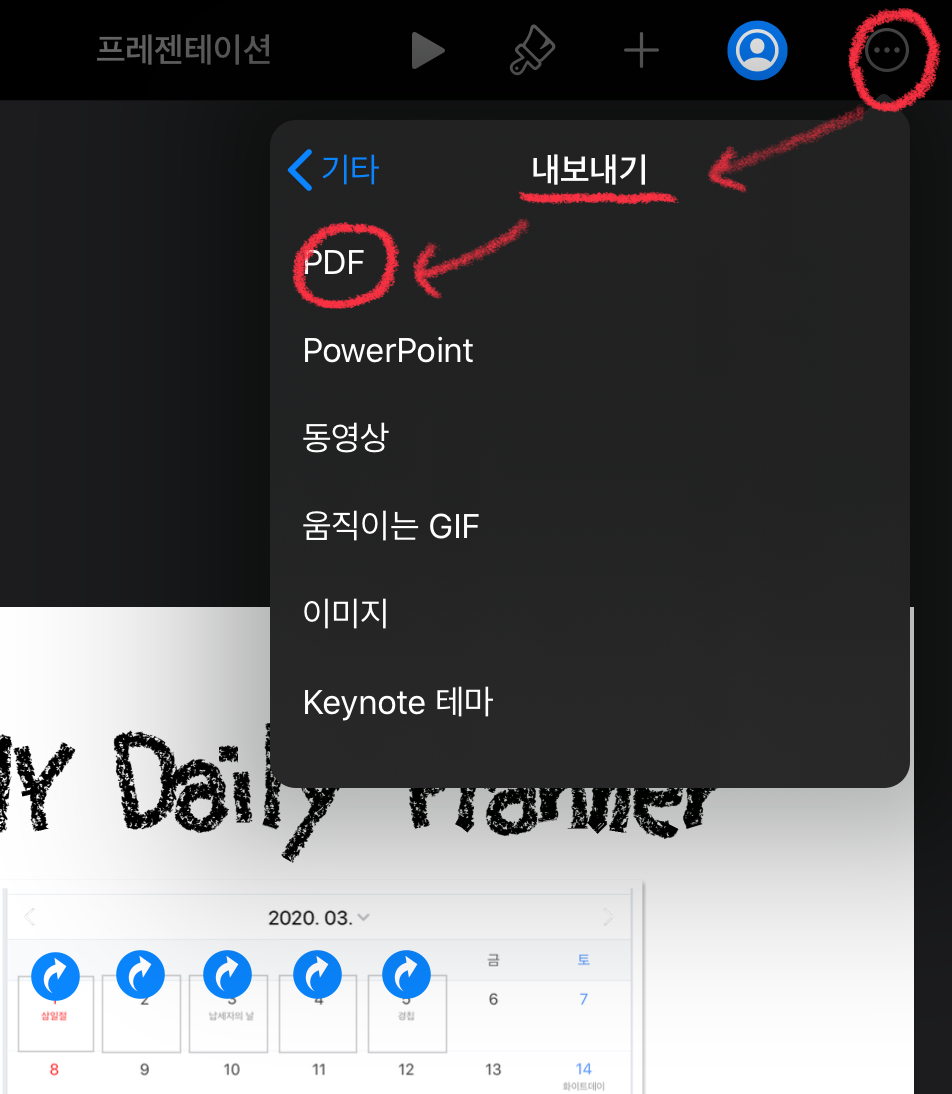 하이퍼 링크를 전부 지정해주고 난 뒤에, 굿노트에서 사용하려면 [내보내기]를 해야 합니다. 아래와 같이 키노트 우측 상단에 있는 점 세 개를 눌러줍니다.