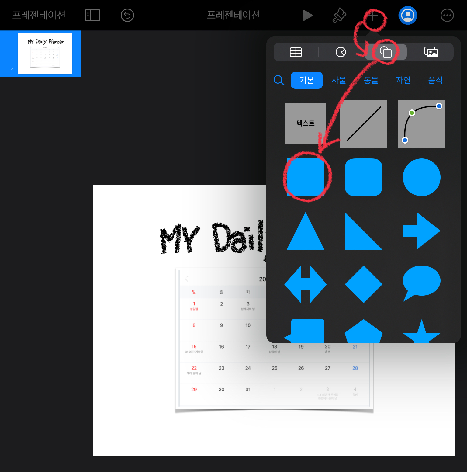 하이퍼 링크는 키노트의 도형을 이용합니다. 아래 화면처럼 [+] 버튼 - 도형 - 기본 에서 사각형 도형을 선택합니다.