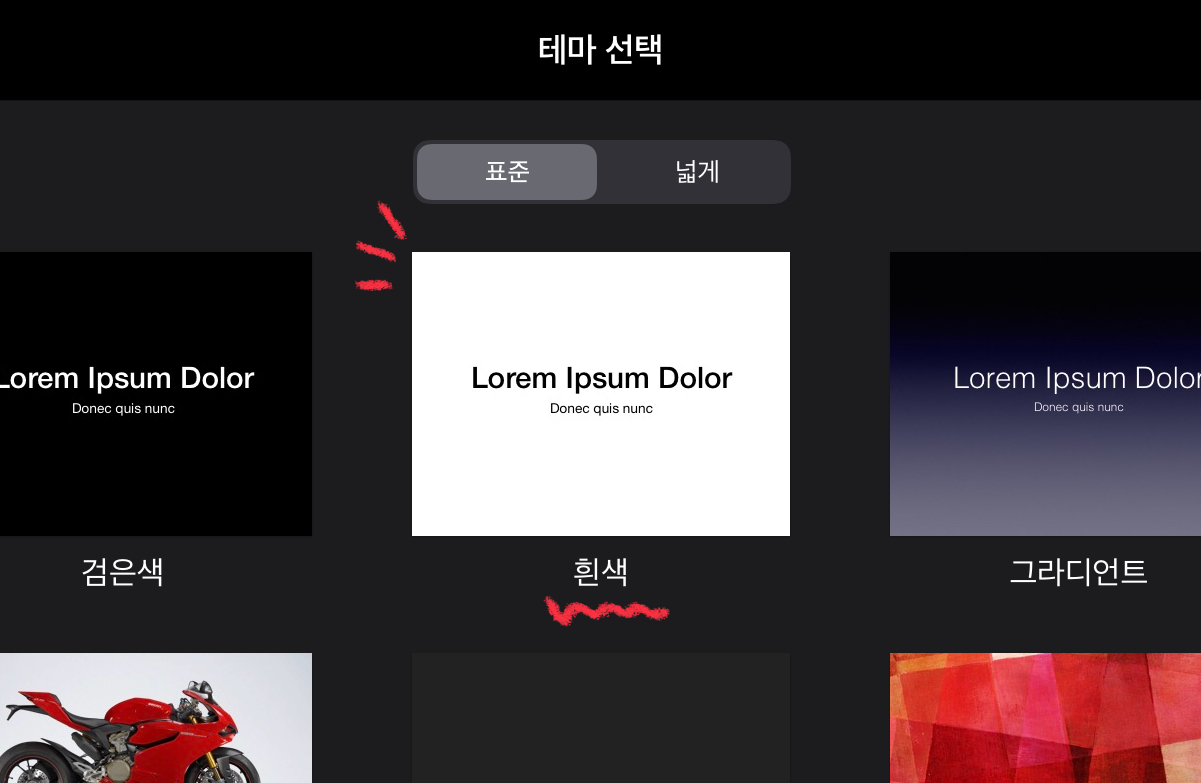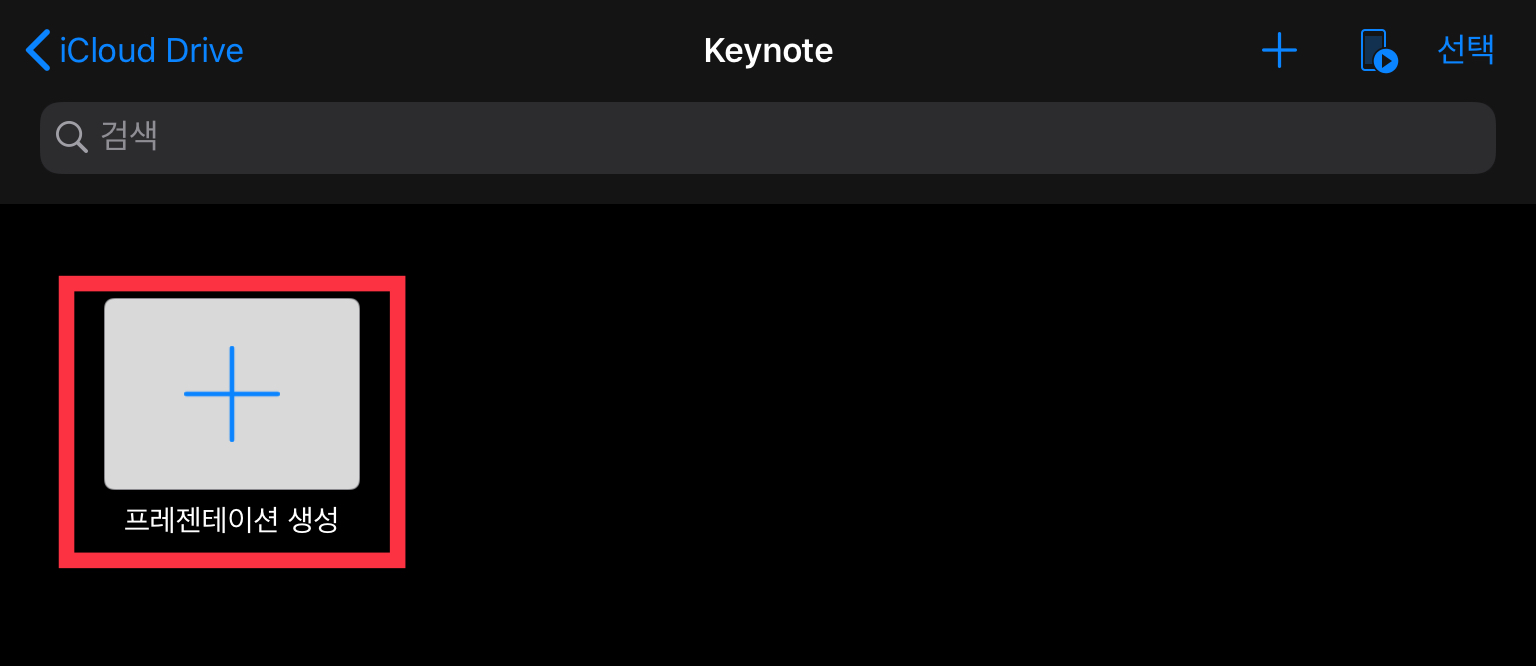 키노트를 실행하면 아래와 같이 [프레젠테이션 생성] 버튼이 보입니다. 그리고 흰색 테마로 선택을 해줍니다.
