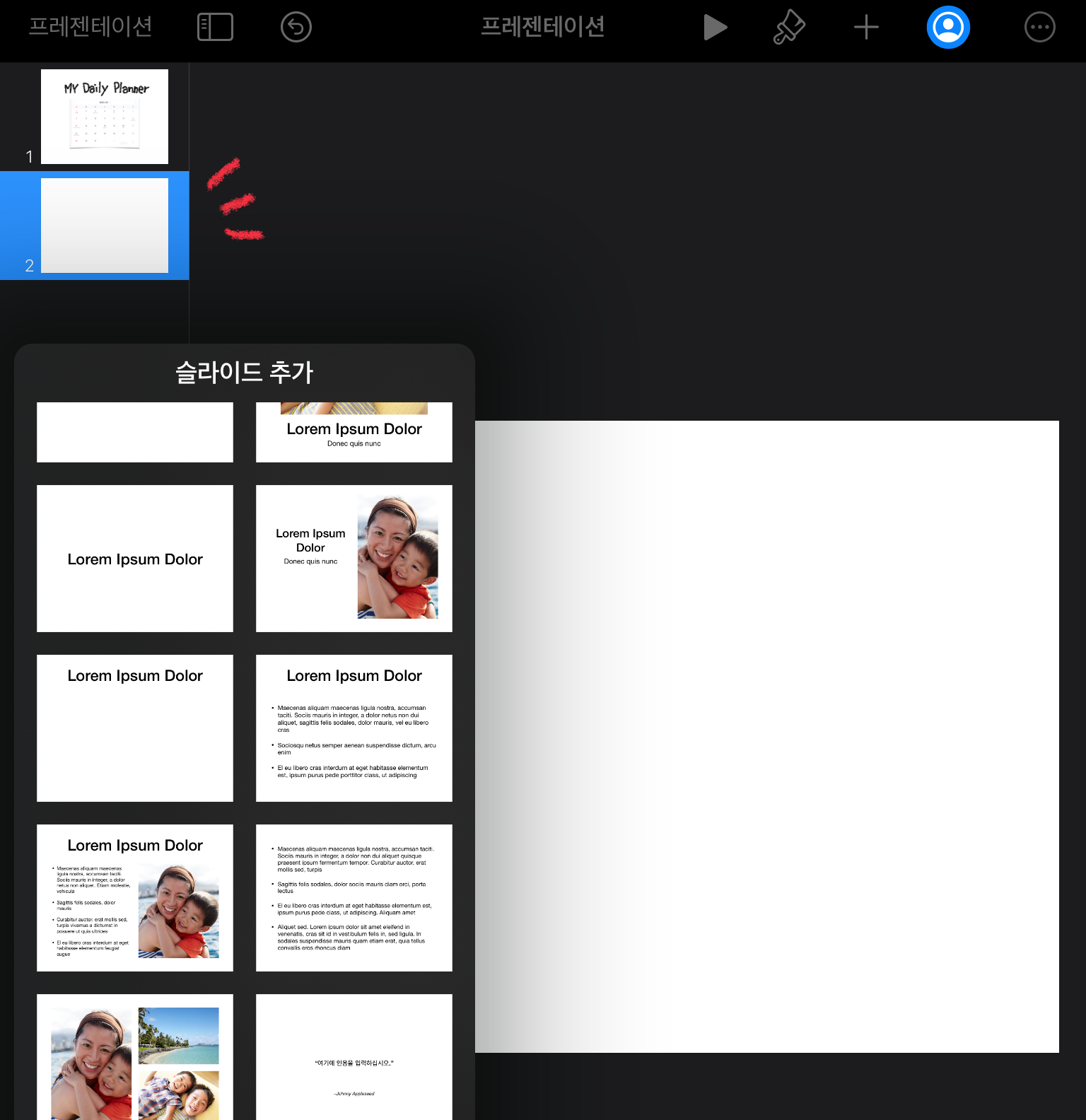 빈 화면에 여러분들이 하이퍼 링크를 넣어줄 화면을 만들어줍니다. 이때 가지고 있는 서식을 이용하시면 됩니다. 혹은 굿노트 안에 기본 서식을 PDF로 내보낸 후에 키노트로 불러와도 됩니다. 이 내용은 따로 올리도록 하겠습니다.