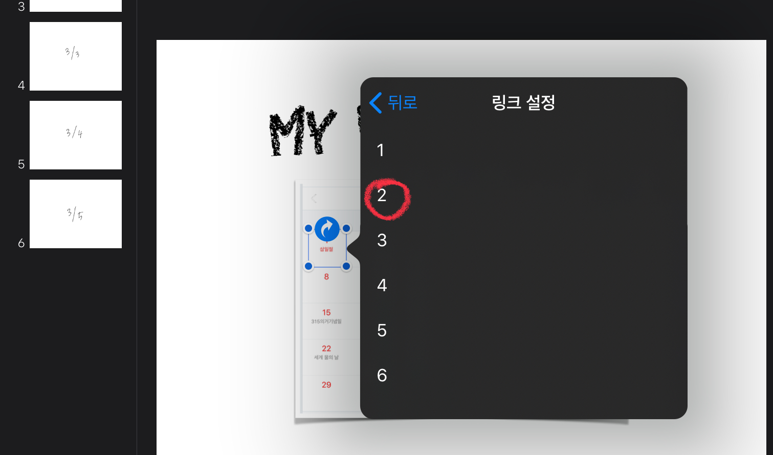 3/1을 클릭하면, 3/1에 해당하는 2번 페이지로 이동하겠다고 지정을 해주는 일입니다. 3/1페이지는 2페이지에 있기 때문에 2번을 눌러줍니다. 슬라이드는 생성된 슬라이드만큼 나타납니다.