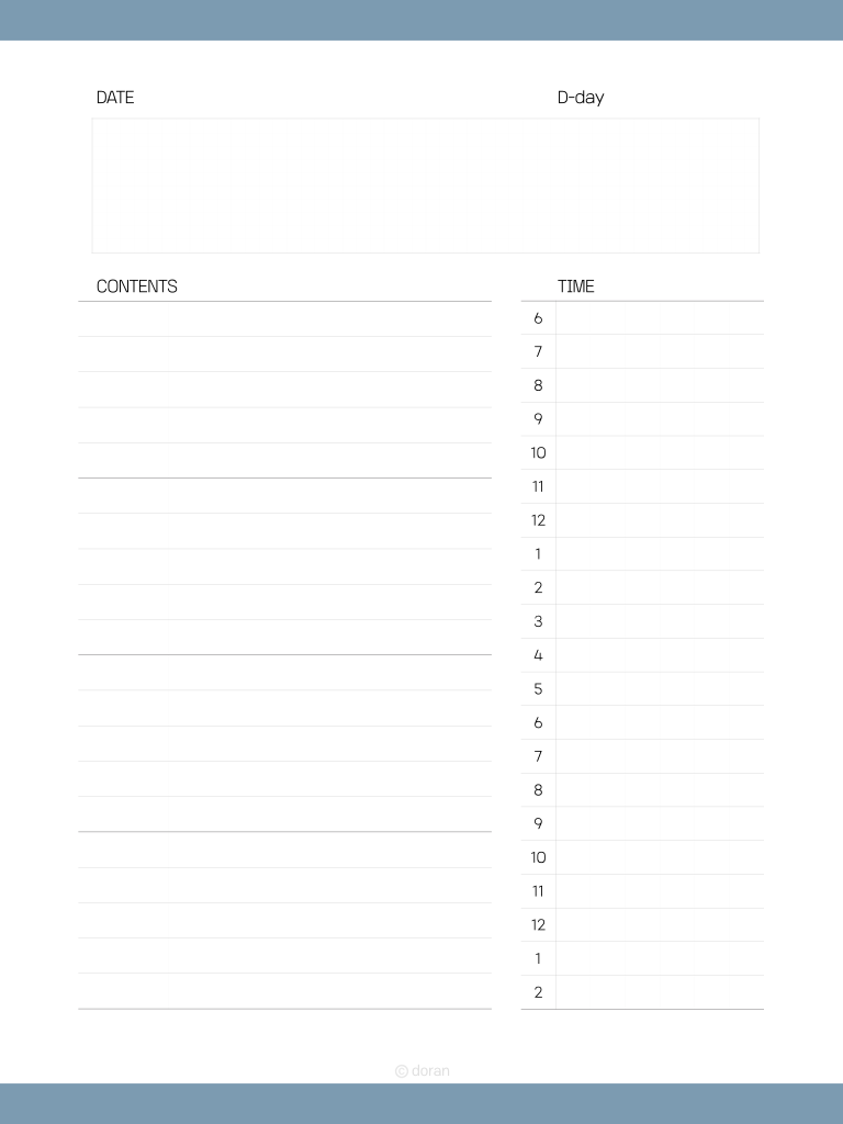 오른쪽에 있는 타임 테이블을 6시부터 새벽 2시까지로 해놓아서 활용도를 높였습니다. 상단 메모 칸을 넓히고 연하게 모눈종이를 넣어 자유롭게 쓸 수 있는 공간도 넓혔습니다. 왼쪽 콘텐츠 창은 5개씩 20개로 해두었고 5칸마다 진한 줄로 만들었습니다. :)