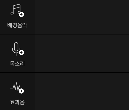 위의 큰 메인 메뉴들을 누르면 외쪽에 작은 메뉴들이 나옵니다. 오디오 메뉴는 배경음악, 목소리, 효과음이라는 하위 메뉴가 나옵니다. 스티커를 선택하면 모션 스티커, 템플릿, 프레임이 나옵니다. 글자를 선택하면 글자, 라벨, 자막이 나오며, PIP를 누르면 이미지, GIF, 비디오가 나옵니다. 필터를 선택하면 필터, 보정, 모자이크 메뉴가 나옵니다.