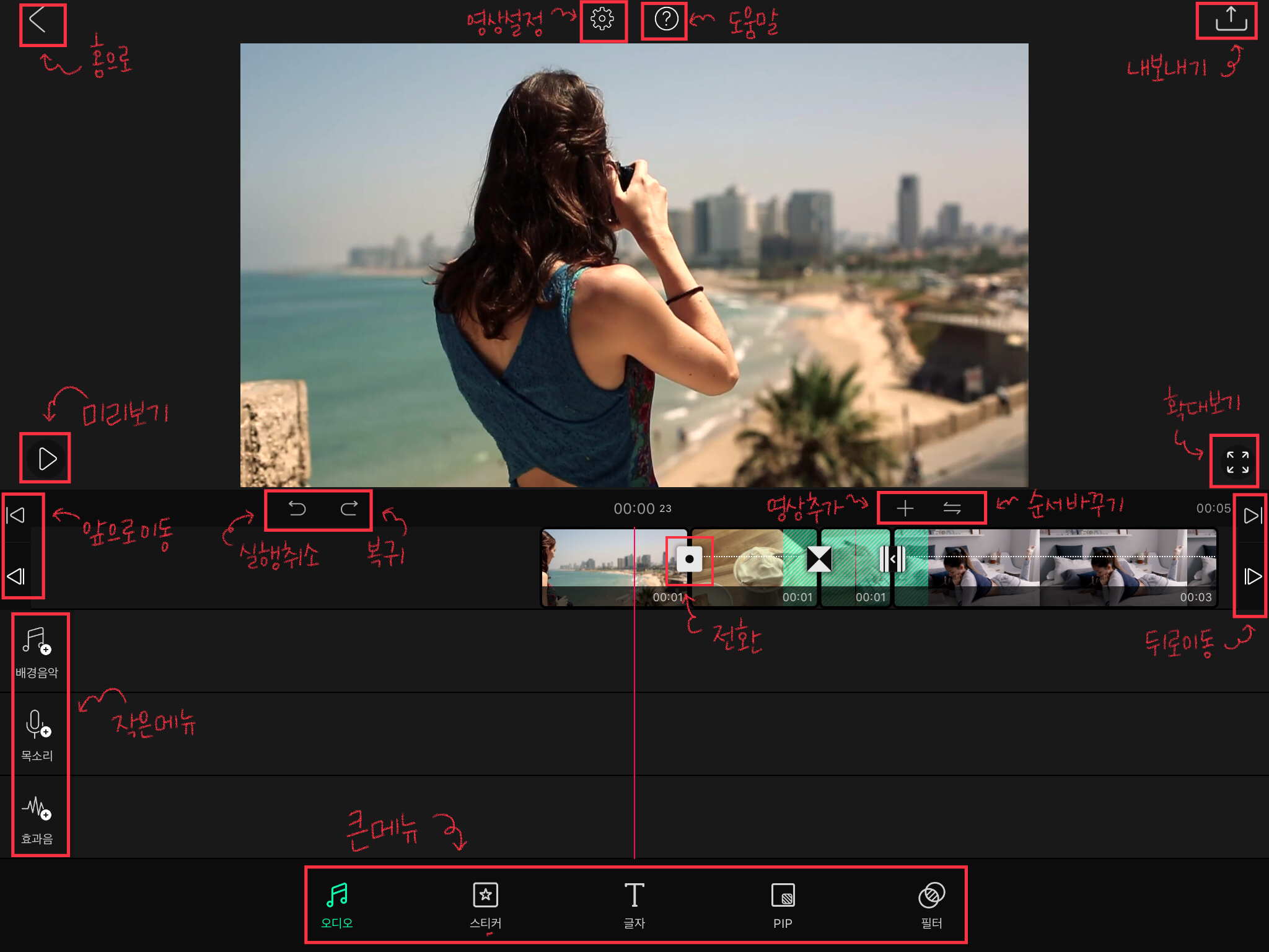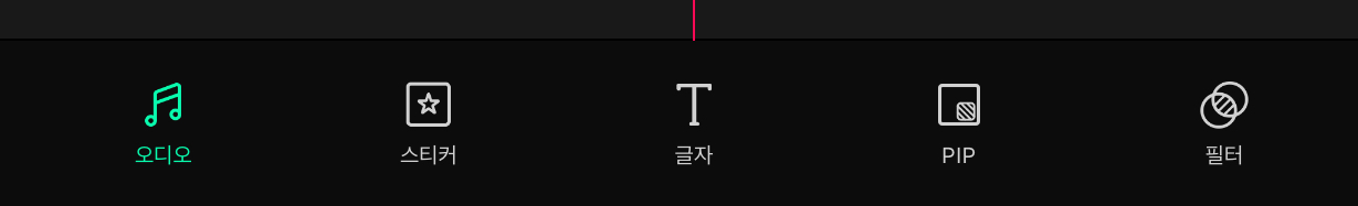 아래에 있는 오디오, 스티커, 글자, PIP, 필터 메뉴는 메인 메뉴입니다. 이 메뉴들을 선택하면 메뉴에 포함되는 작은 메뉴들이 나타납니다.