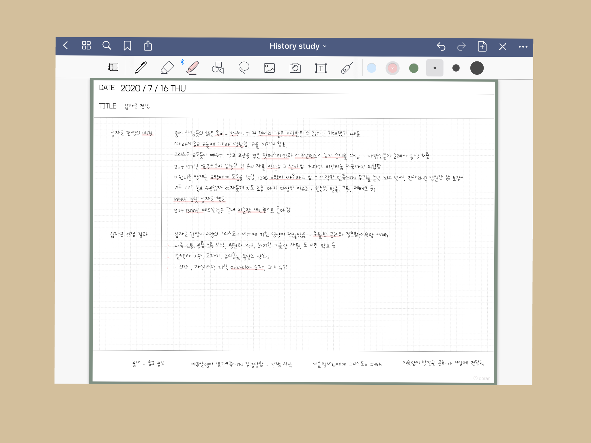 평소 아이패드를 가로로 놓고 사용하는 편입니다. 공부하는 내용들을 정리하기 위해서 날짜와 제목을 적은 가로형 스터디 노트를 만들어보았어요. 코넬노트 형식을 가지고 왔습니다. 왼쪽에는 소제목을 적고 아래칸에는 정리한 키워들을 적을 수 있습니다.