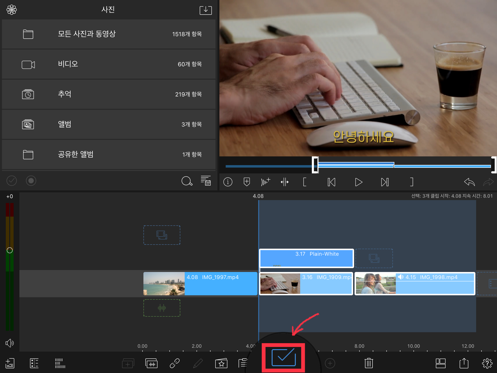 아래 선택 버튼이 파란색으로 변합니다. 그리고 원하는 클립들을 여러개 선택합니다. 드래그 선택도 가능합니다.
