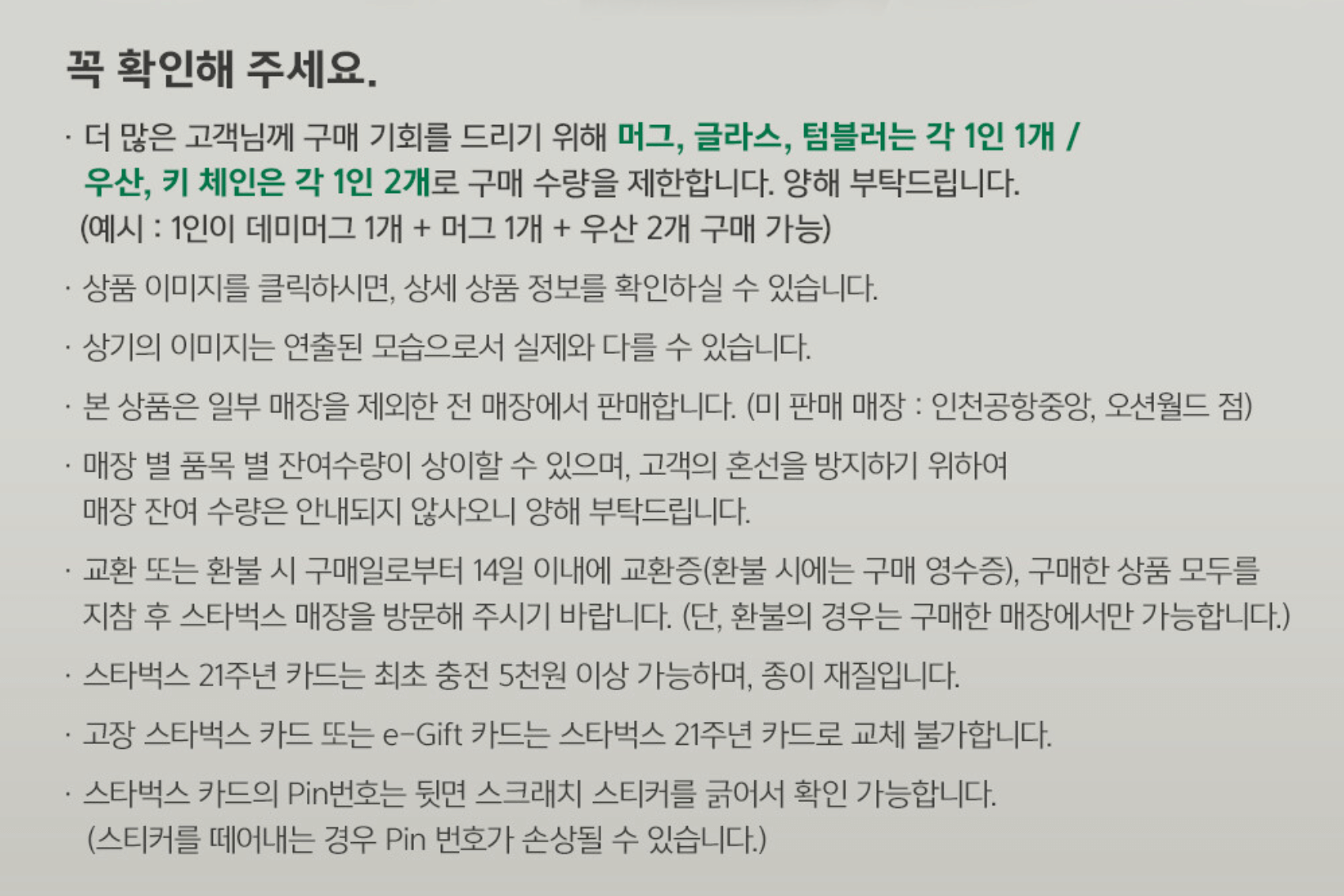 스타벅스 21주년 기념 상품의 종류는 카드를 제외하고 총 6가지입니다. 머그, 데미 머그, 글라스, 텀블러, 우산, 그리고 키체인이 있습니다. 여기서 머그, 데미 머그, 글라스, 텀블러 이 네 가지 상품은 1인 1개만 구매가 가능하고, 우산과 키체인은 1인 2개까지만 구매가 가능합니다.