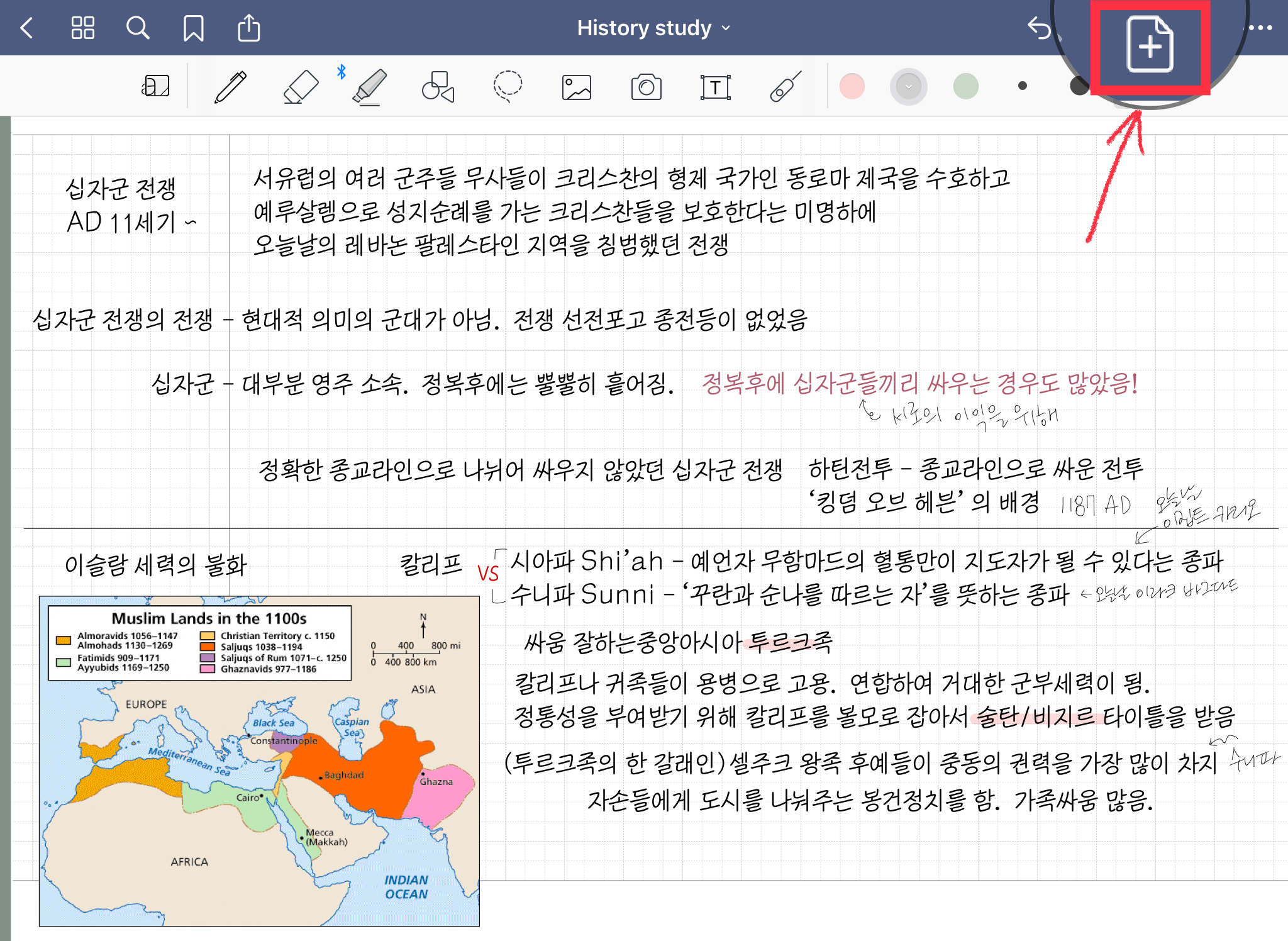 굿노트 1번 페이지에서 상단에 있는 [문서 +] 버튼(페이지 추가)을 누릅니다.
