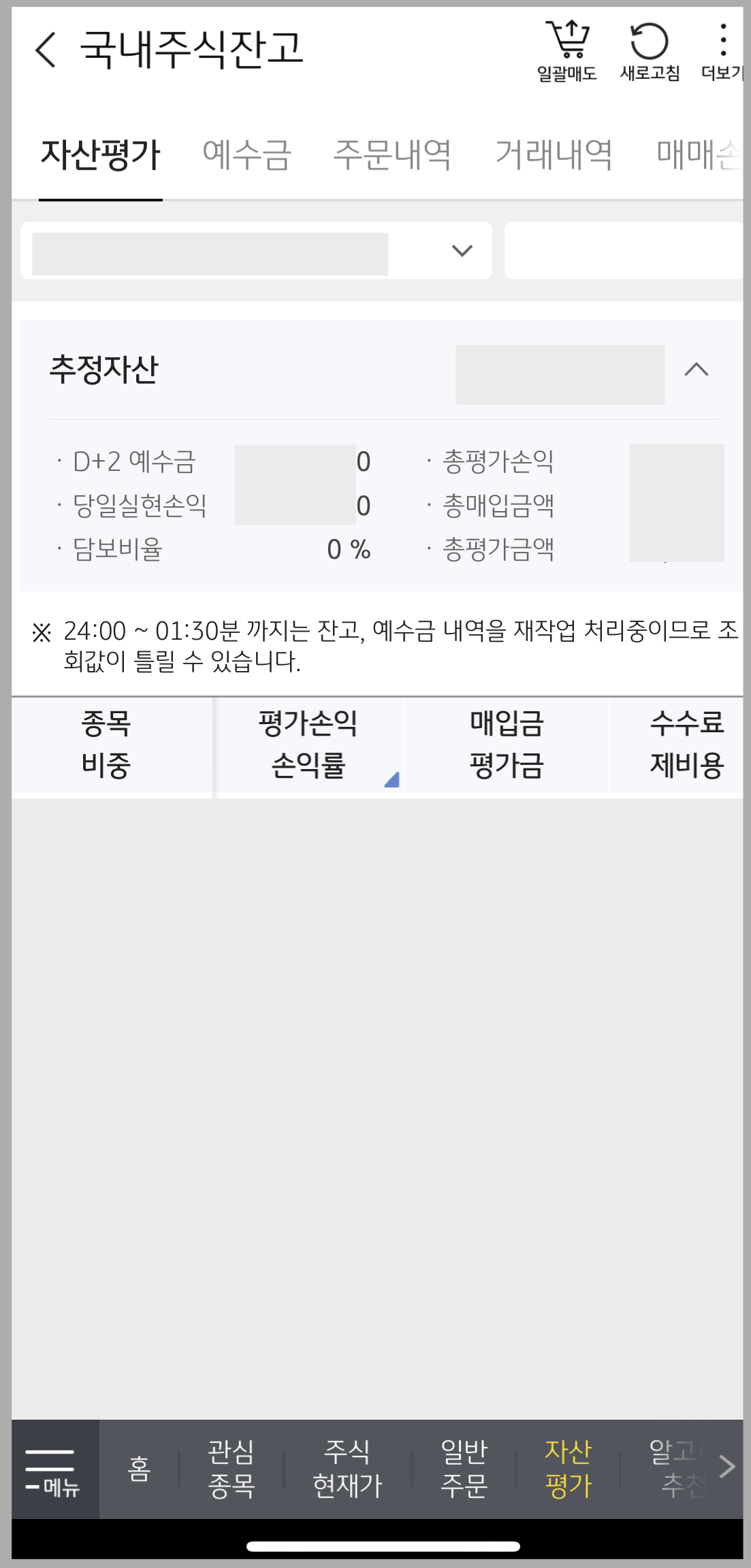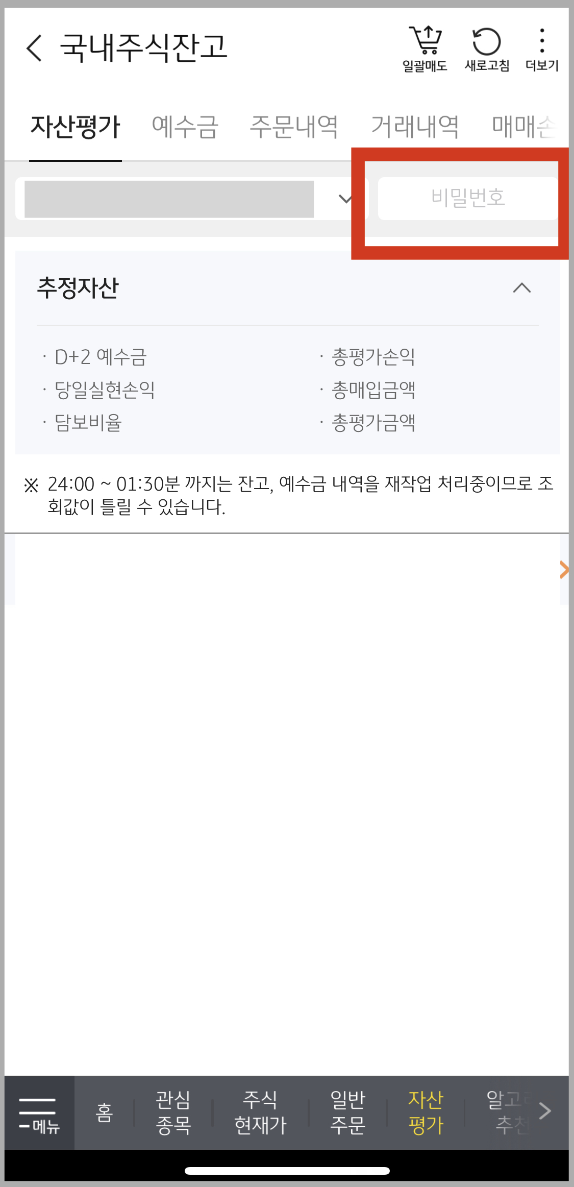 자산 평가를 눌러도 금액이 나오지 않습니다. 상단 비밀번호 칸에 [주식 계좌 비밀번호]를 입력해야 합니다.