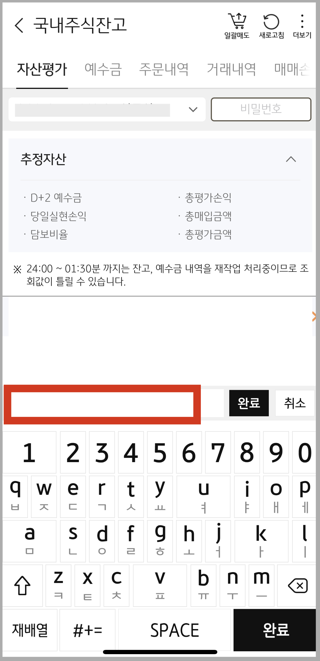 자산 평가를 눌러도 금액이 나오지 않습니다. 상단 비밀번호 칸에 [주식 계좌 비밀번호]를 입력해야 합니다.