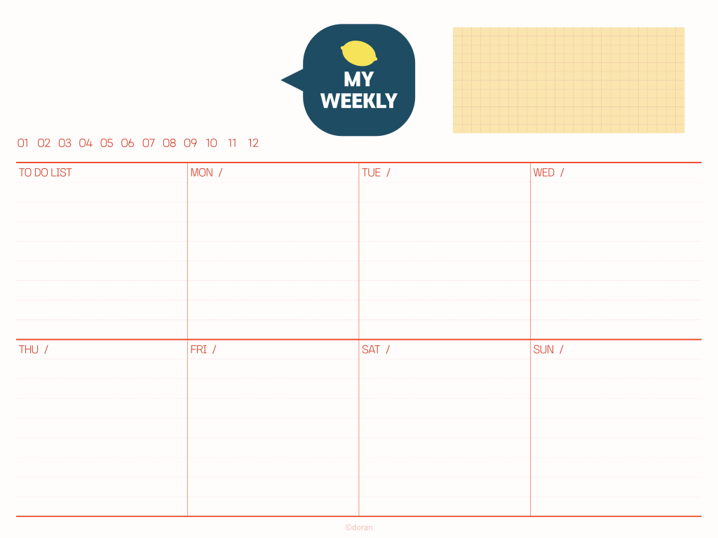 왼쪽 상단에 12개월을 숫자로 적어놓았습니다. 해당하는 달에 표시를 해두고 사용하면 됩니다. 오른쪽 상단에는 메모 칸을 두었어요. 그 주에 해야 할 중요한 일들이나 기억해야 할 사항들을 적어놓으면 좋을 것 같습니다.