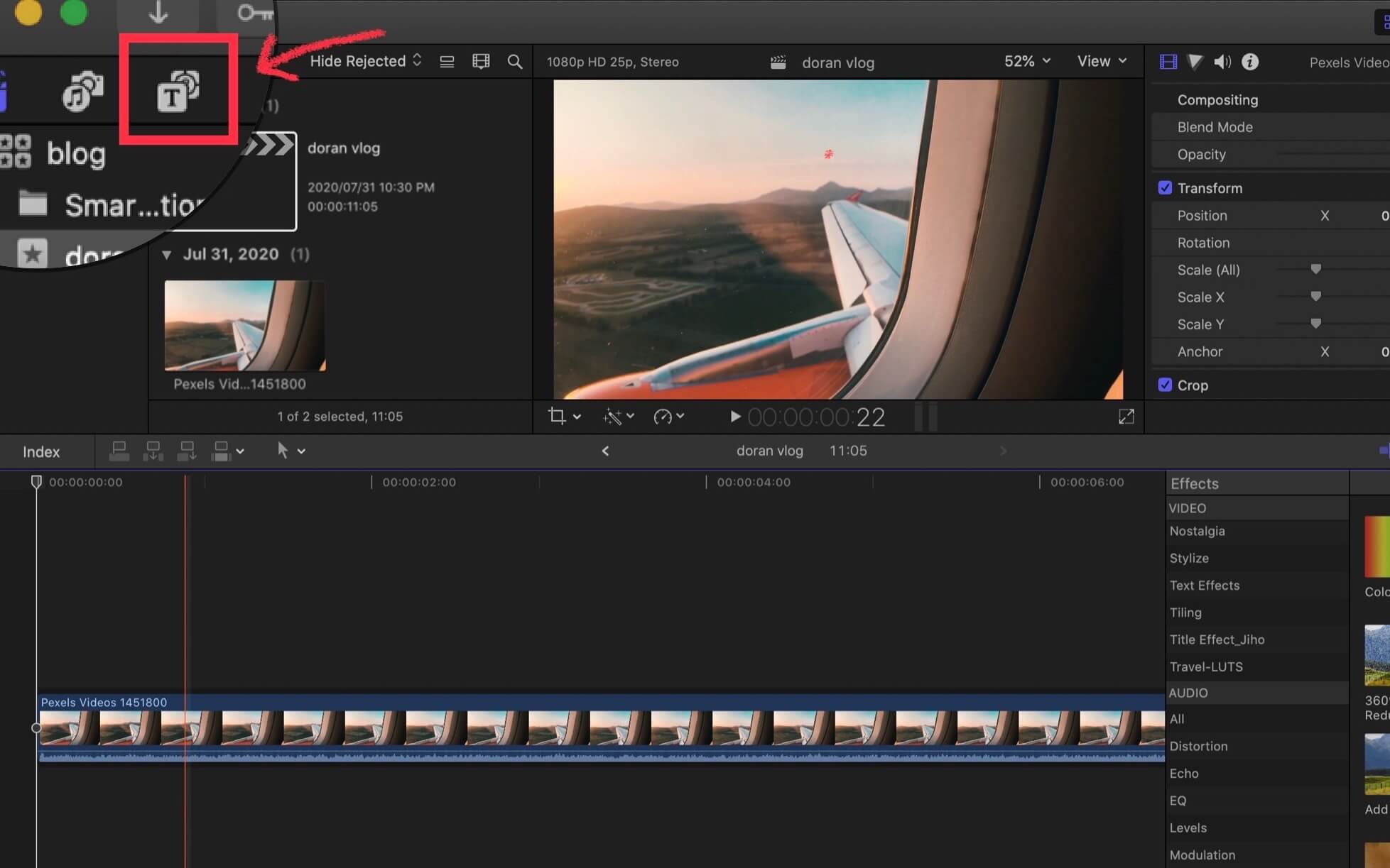 파이널 컷의 왼쪽 상단에 있는 T 버튼을 선택합니다.