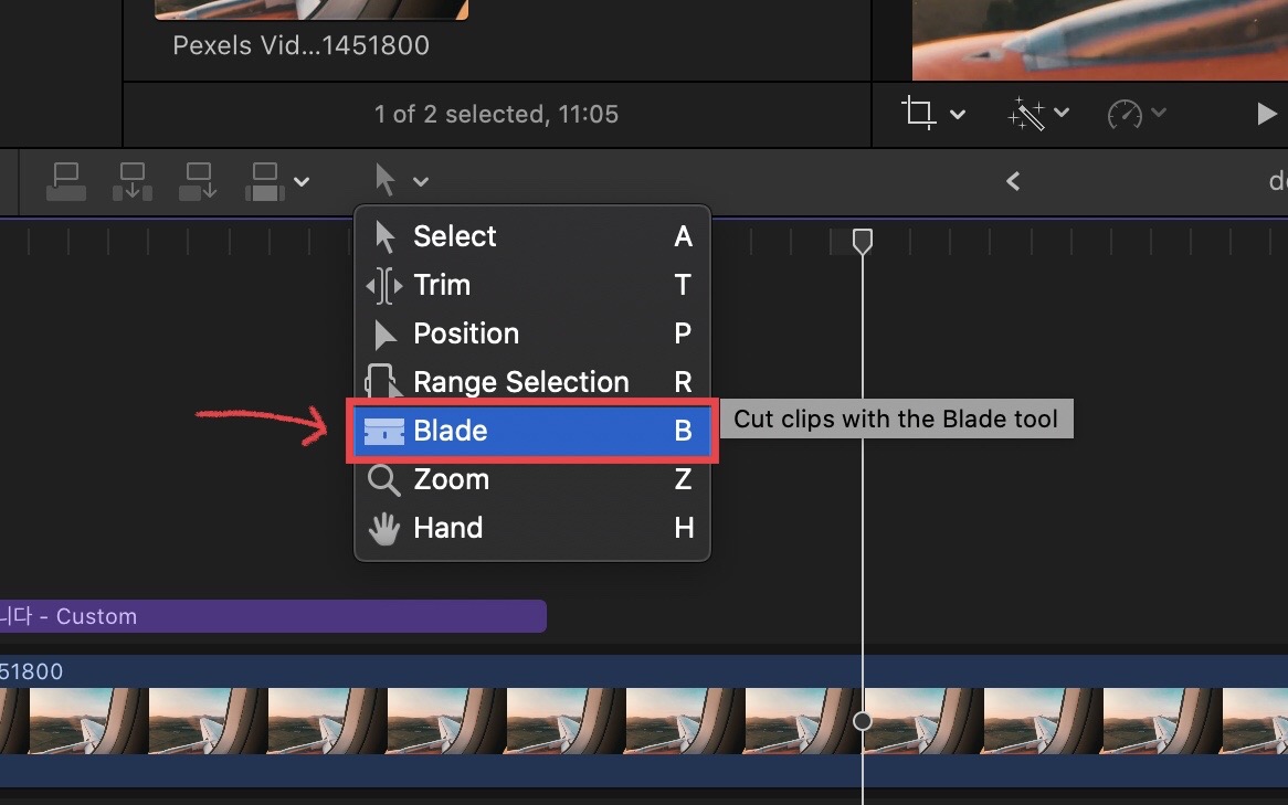 여기서 자르기 도구인 [Blade]를 선택합니다.
