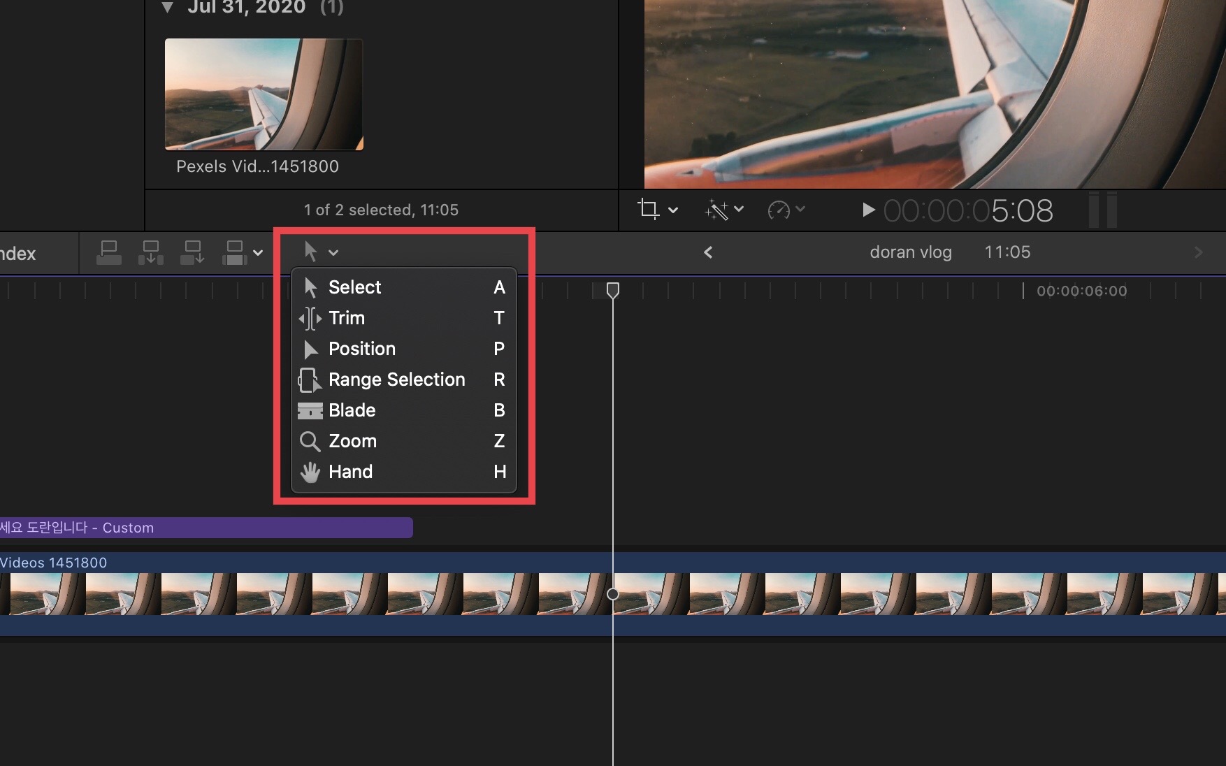 Select, Trim, Position, Range Selection, Blade, Zoom, Hand 이렇게 총 7개의 도구가 나옵니다.
