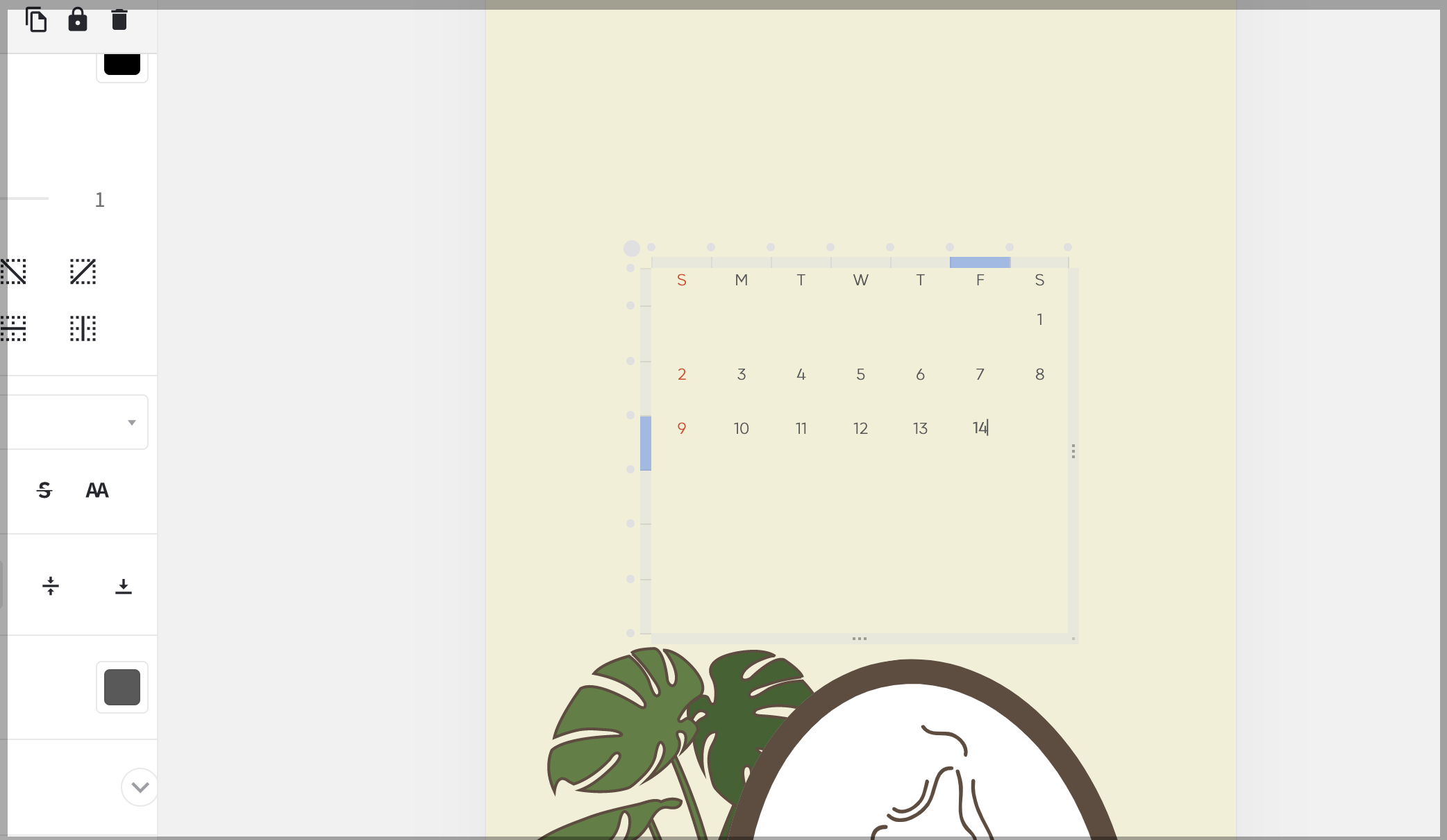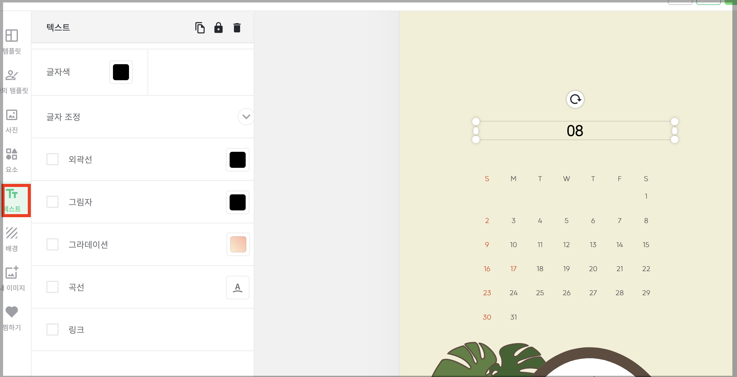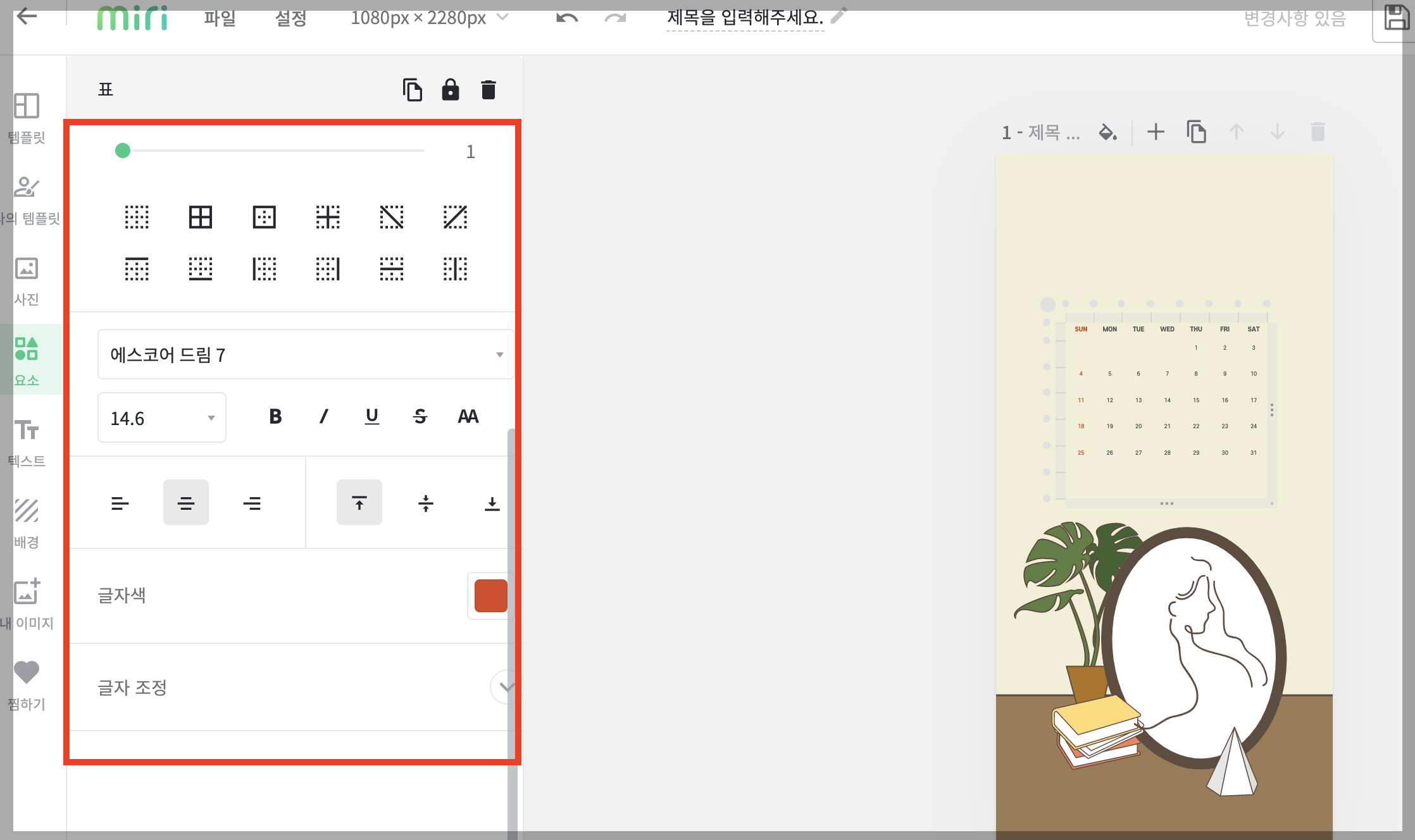 글씨를 바꾸거나 이미지 크기 혹은 객체를 변경해도 됩니다. 달력이 들어간 배경화면을 만들어 주기 위해서는 글자만 삭제하고 그 자리에 캘린더를 넣어줍니다.
