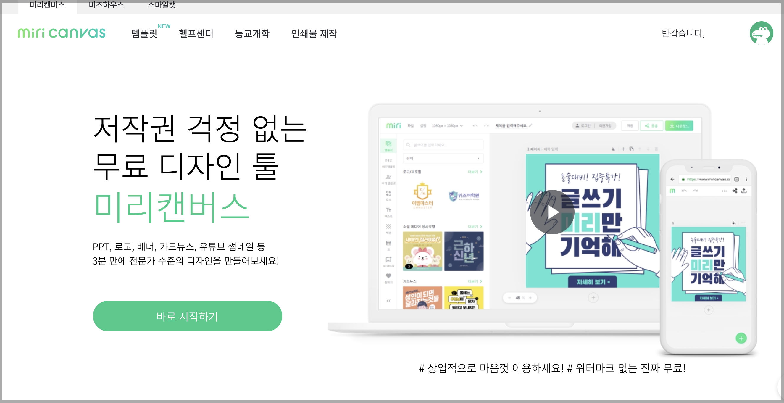 미리 캔버스 웹사이트에 접속합니다. (미리캔버스 웹사이트 바로가기) 편집 후 다운로드를 위해서는 회원가입이 필요합니다.