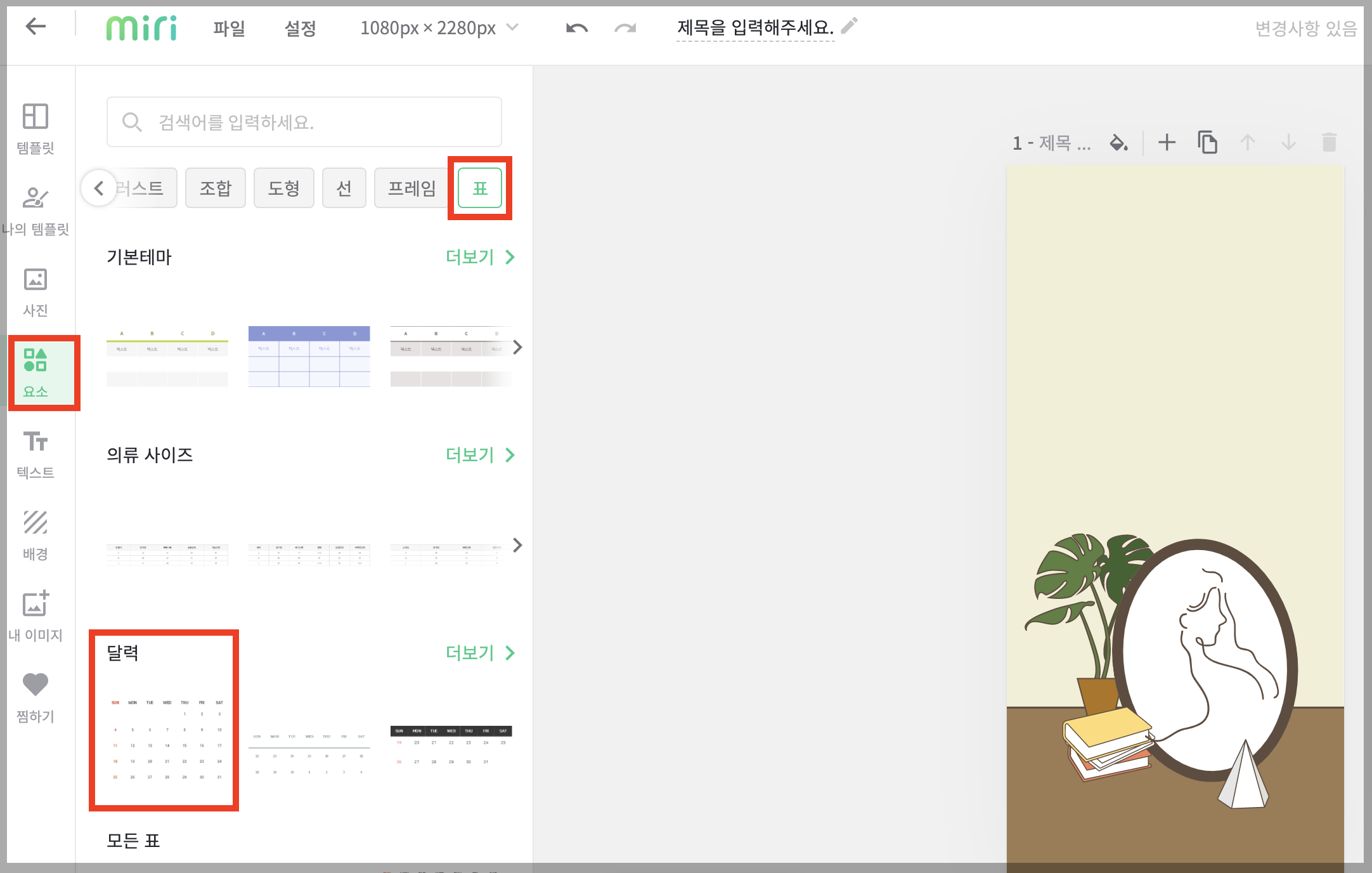 [요소] - [표] - [달력]을 눌러서 선택합니다. 아래와 같이 기본 달력이 나옵니다. 왼쪽 편집창에서 달력에 관련된 내용을 수정할 수 있습니다.