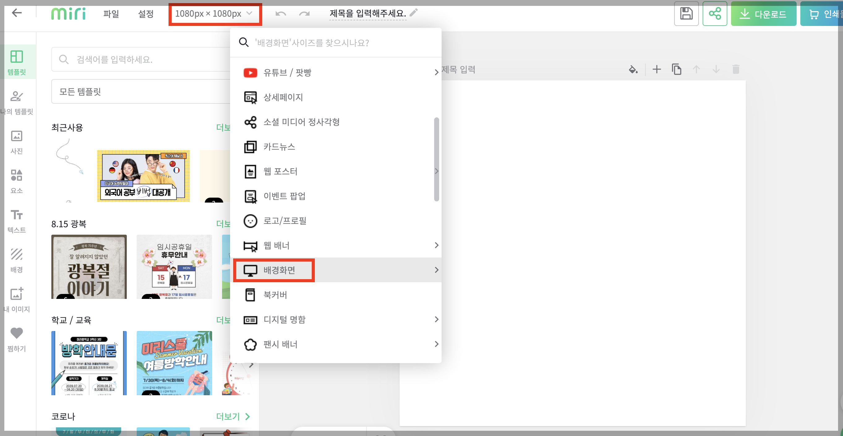 상단 [1080px X1080 px]가 적힌 곳을 선택한 뒤, [배경화면]을 선택합니다. 그리고 아래와 같이 본인의 기종에 맞는 사이즈를 선택합니다.