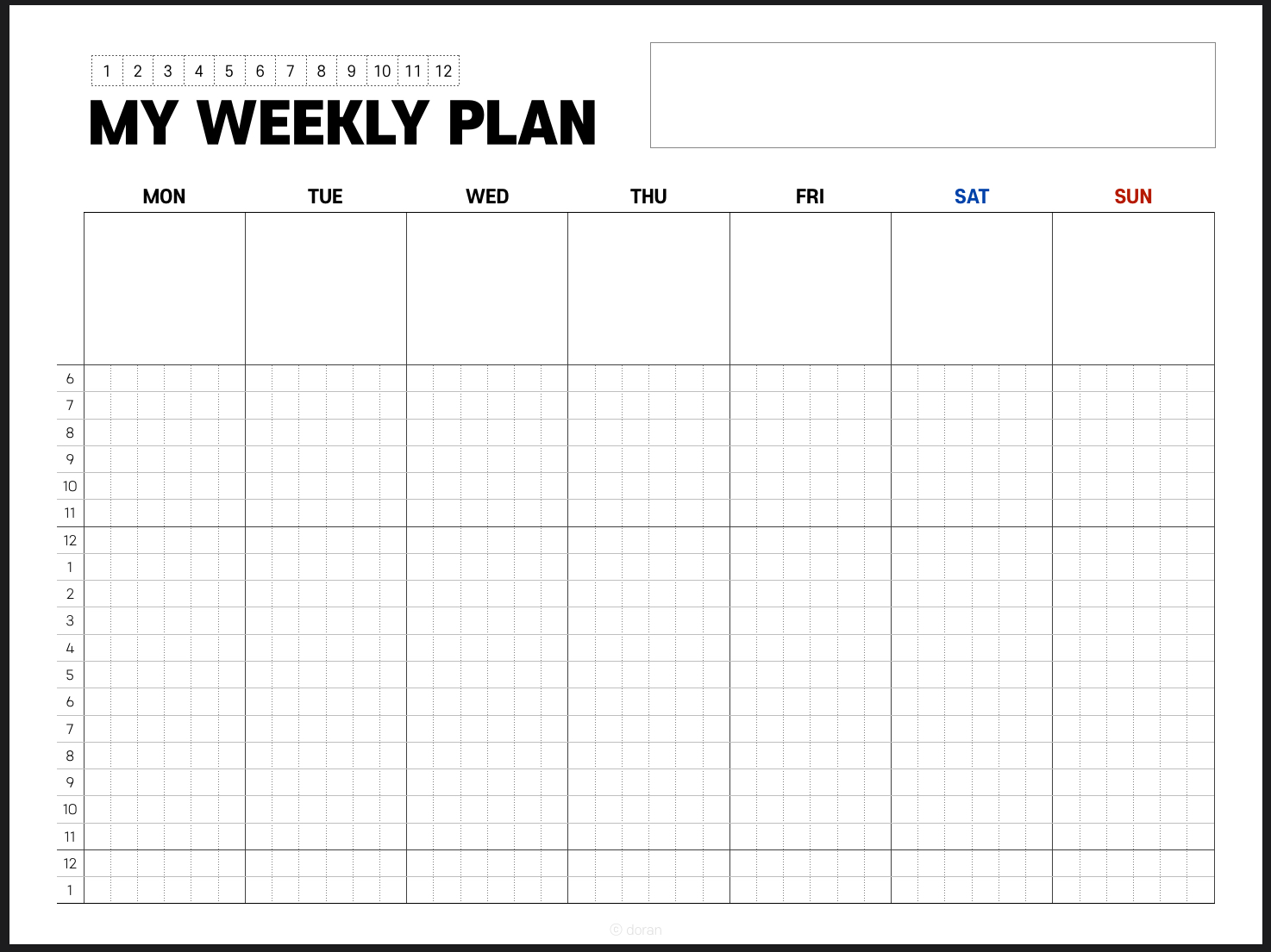 가장 상단에는 해당하는 달을 표시할 수 있고, 상단 오른쪽에는 주간 목표를 적을 수 있도록 칸을 비워두었습니다.