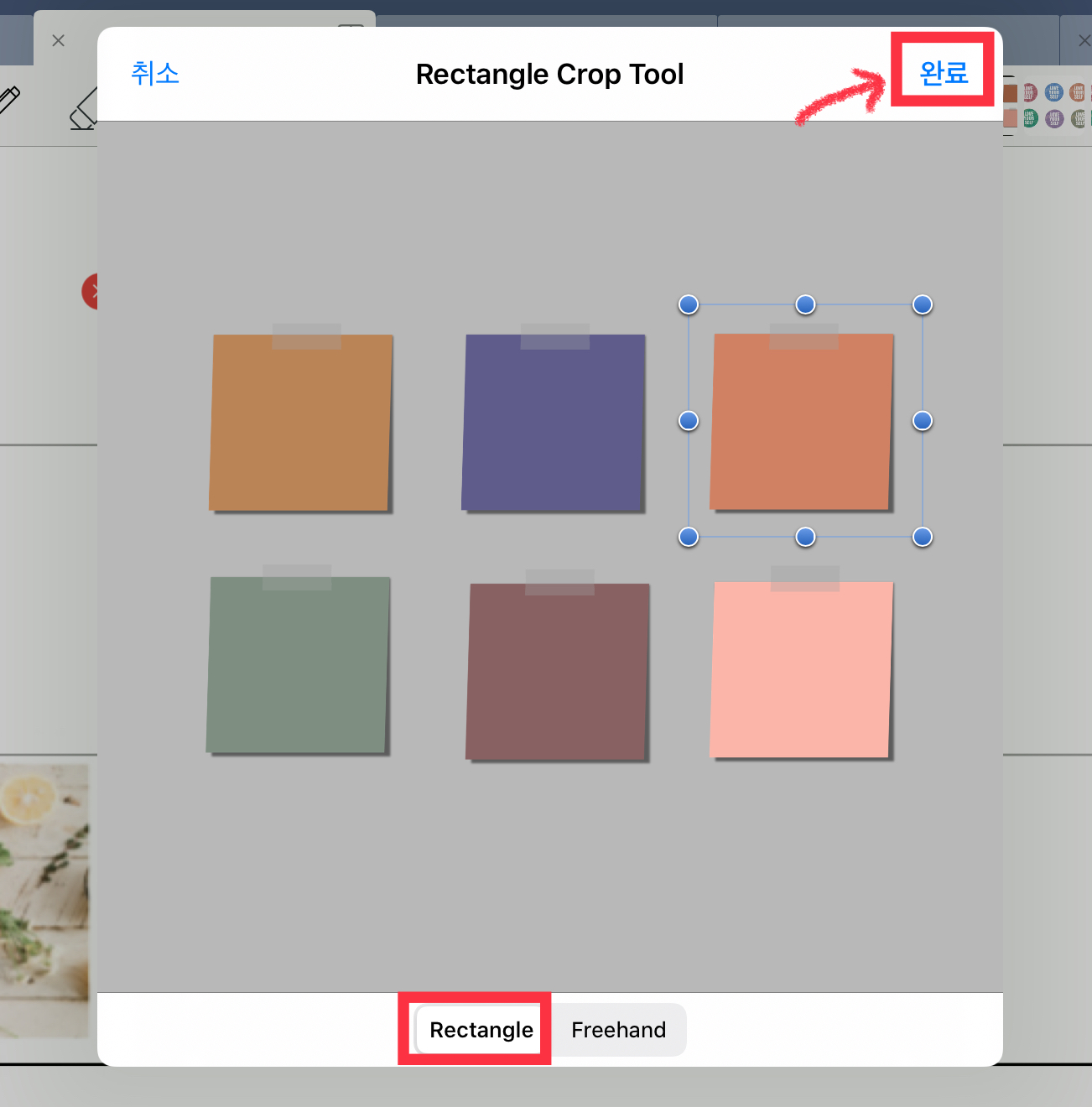 여기서 [자르기]를 선택한 뒤, 원하는 만큼 잘라주세요. Freehand를 선택하면 자유롭게 자르기를 할 수 있습니다. 그리고 [완료]를 눌러줍니다.