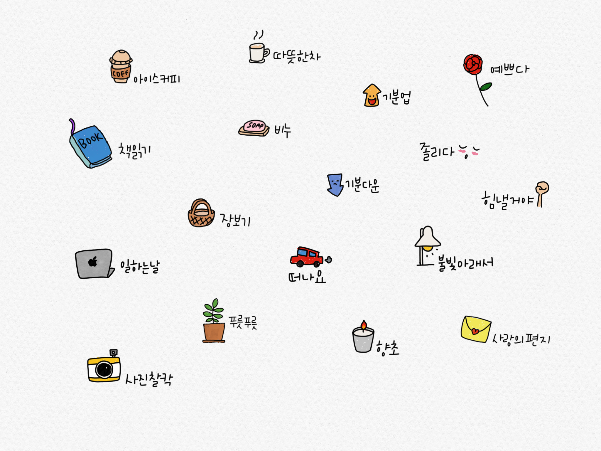 안녕하세요. 오랜만에 손으로 그린 굿노트 일상 스티커를 가지고 왔습니다 :) 요즘 굿노트도 키보드를 사용하다 보니, 확실히 펜슬로 그림을 그리는 일이 줄어든 것 같아요. 그래서 오랜만에 애플 펜슬로 이것저것 그려보았답니다.