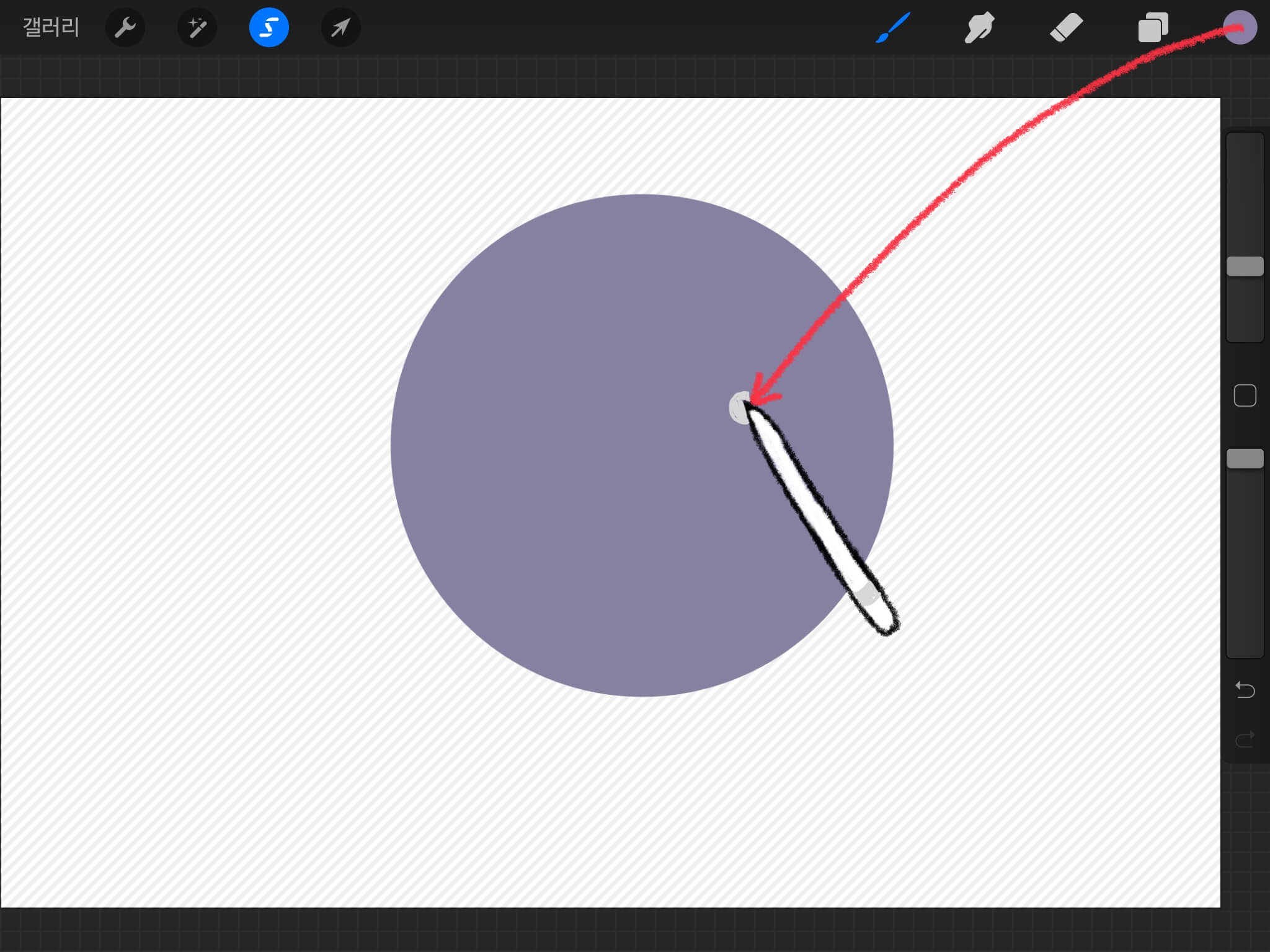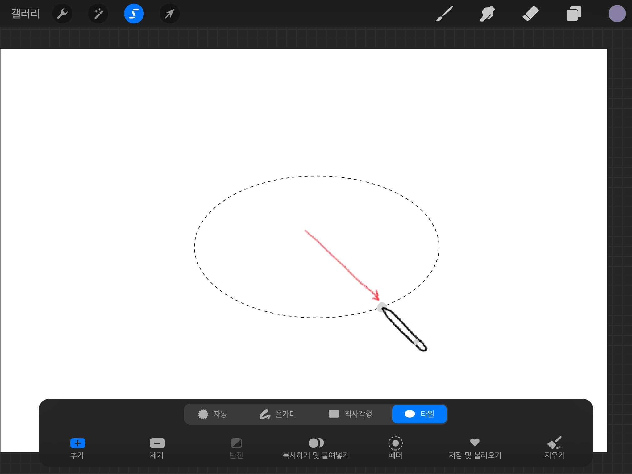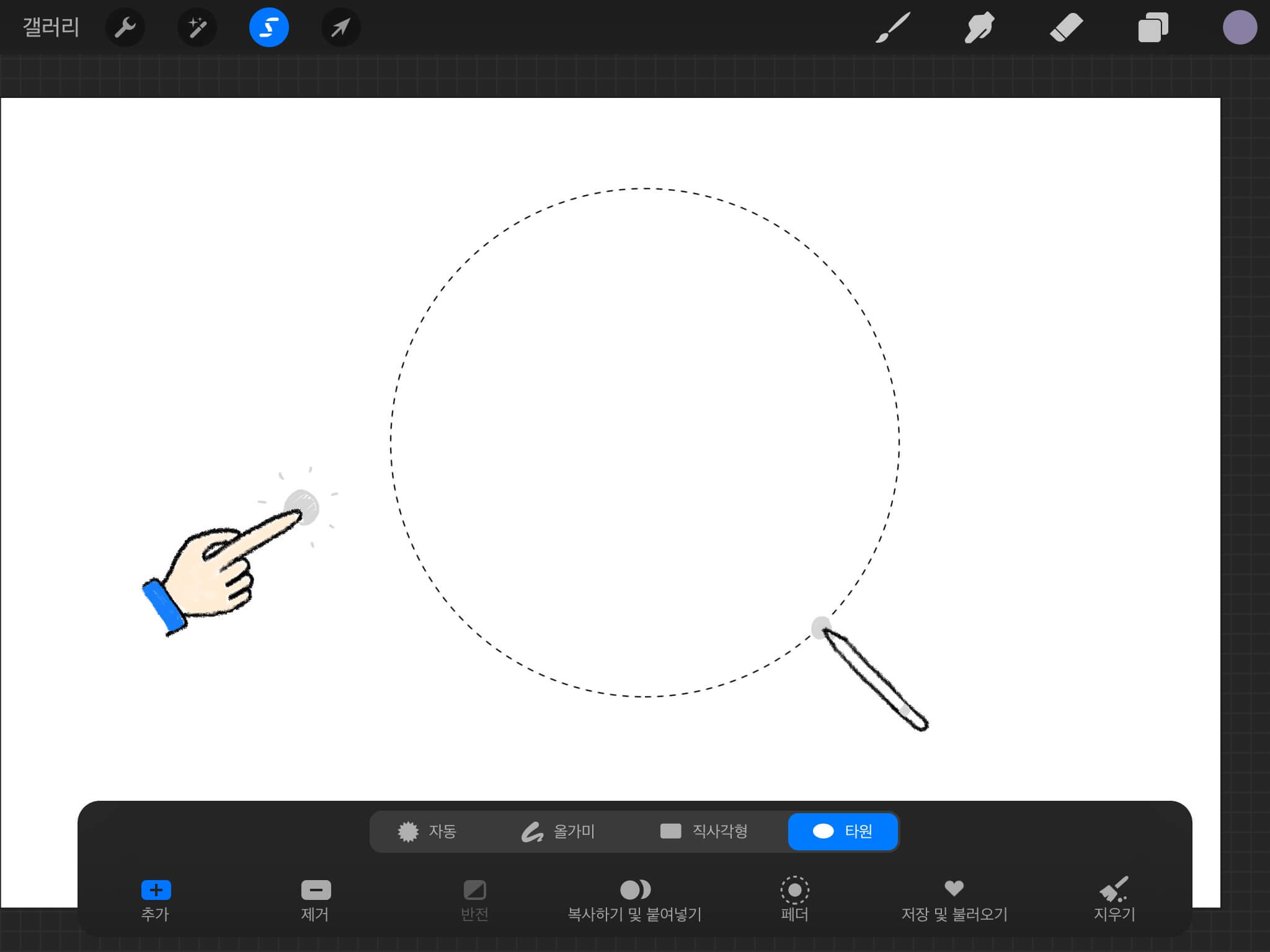 여기서 펜슬을 떼지 않은 채 손가락을 터치하면 동그라미가 만들어집니다. 이대로 손과 펜슬을 떼면 아래와 같이 원형 모양으로 선택이 됩니다.
