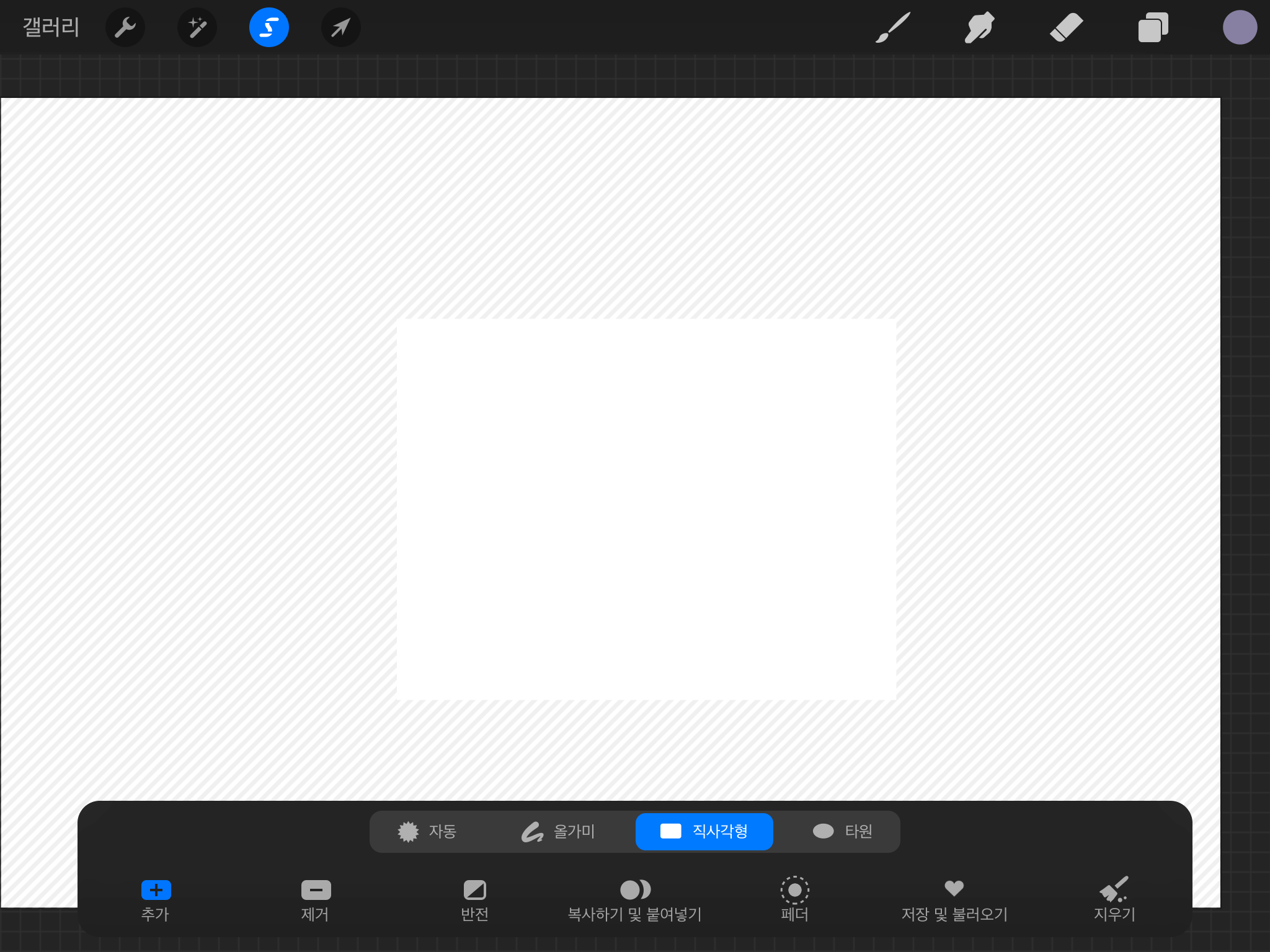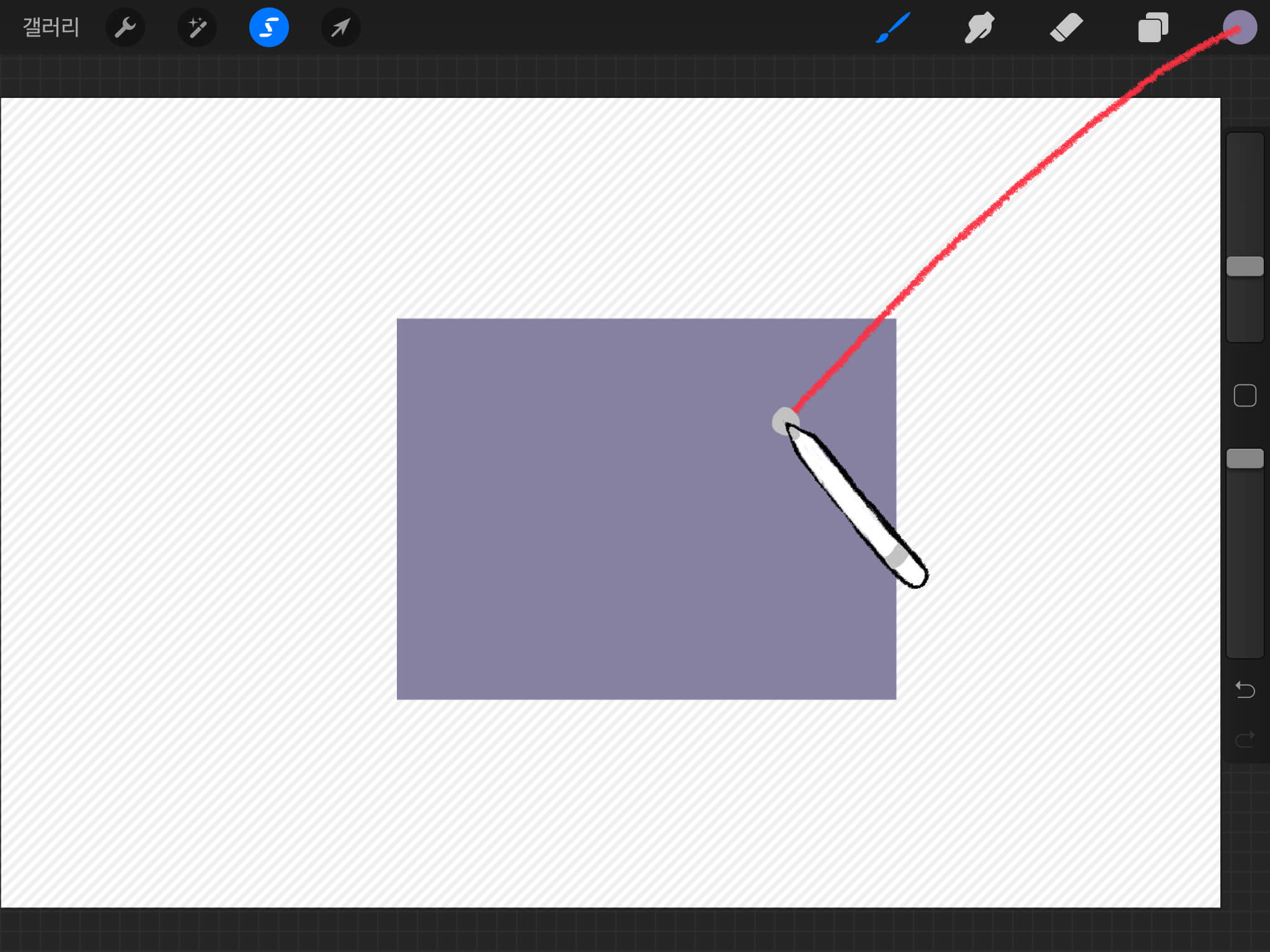 사선 방향으로 펜슬을 그으면 도형이 그려집니다. 그리고 펜슬을 떼면 아래와 같이 직사각형 모양이 선택 됩니다.