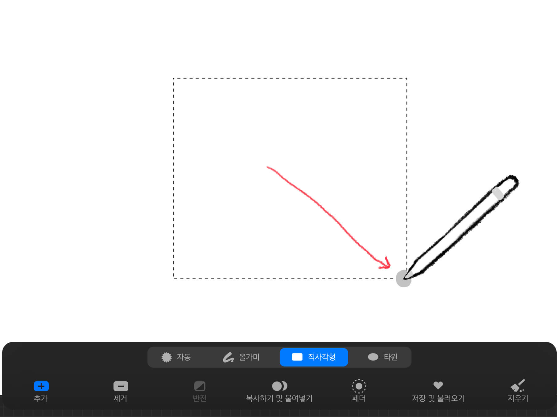 사선 방향으로 펜슬을 그으면 도형이 그려집니다. 그리고 펜슬을 떼면 아래와 같이 직사각형 모양이 선택 됩니다.