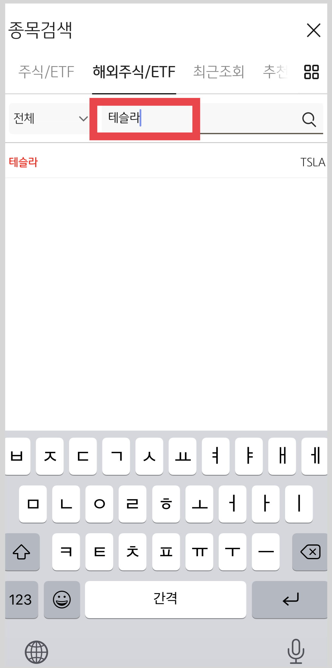 이 메뉴를 누른 뒤 검색하고자 하는 해외 주식 종목을 검색합니다. 테슬라를 검색해보았어요.