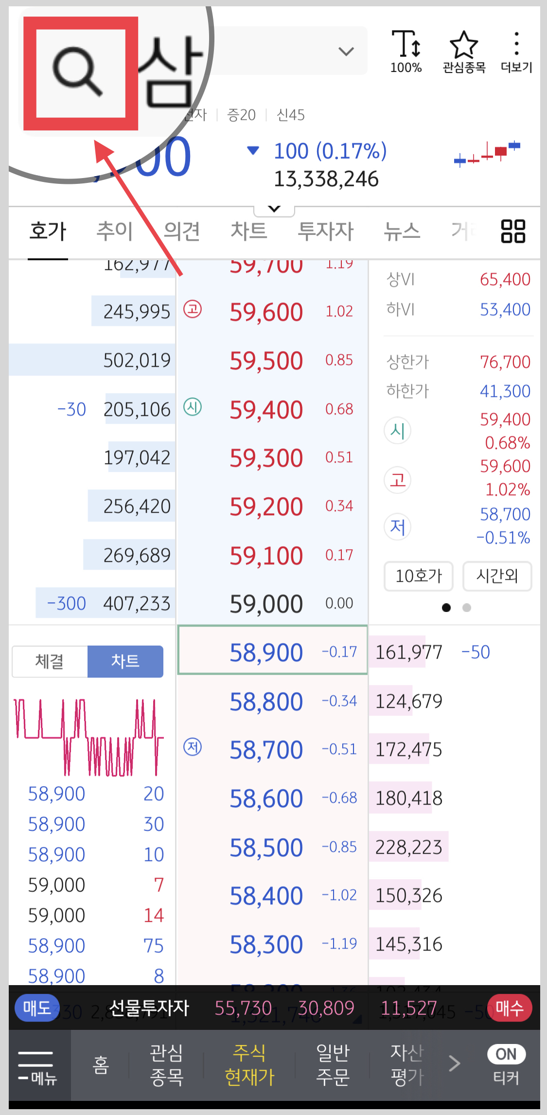 기본적으로 본인이 최근에 검색했던 종목이 나옵니다. 여기서 상단의 [돋보기] 버튼을 눌러주세요. (국내 주식과 동일합니다)