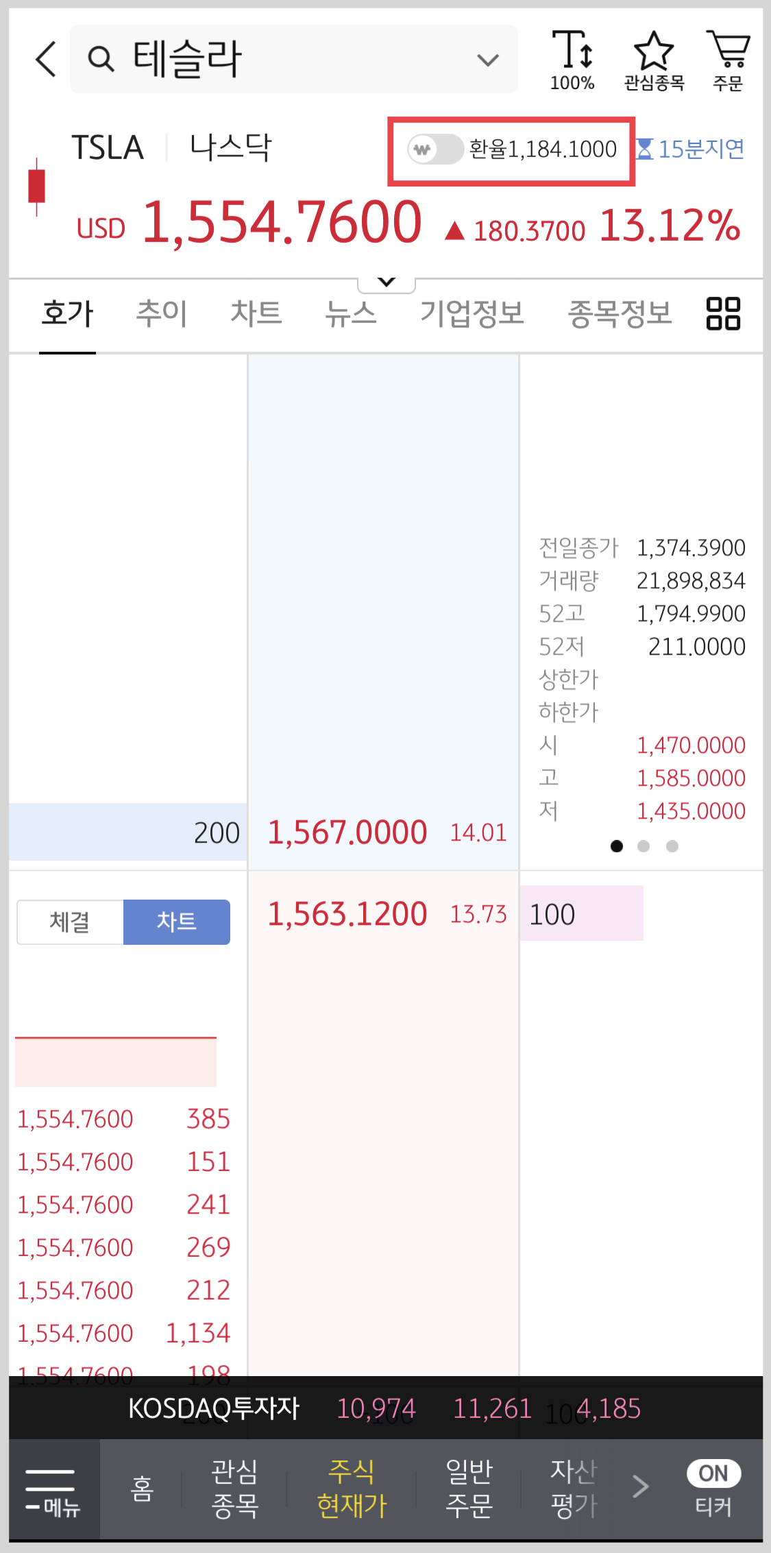 아래와 같이 테슬라의 현재 주식 가격을 검색할 수 있습니다. 상단의 환율 버튼을 누르면, 자동으로 환율이 적용되어 한화로 표시됩니다.