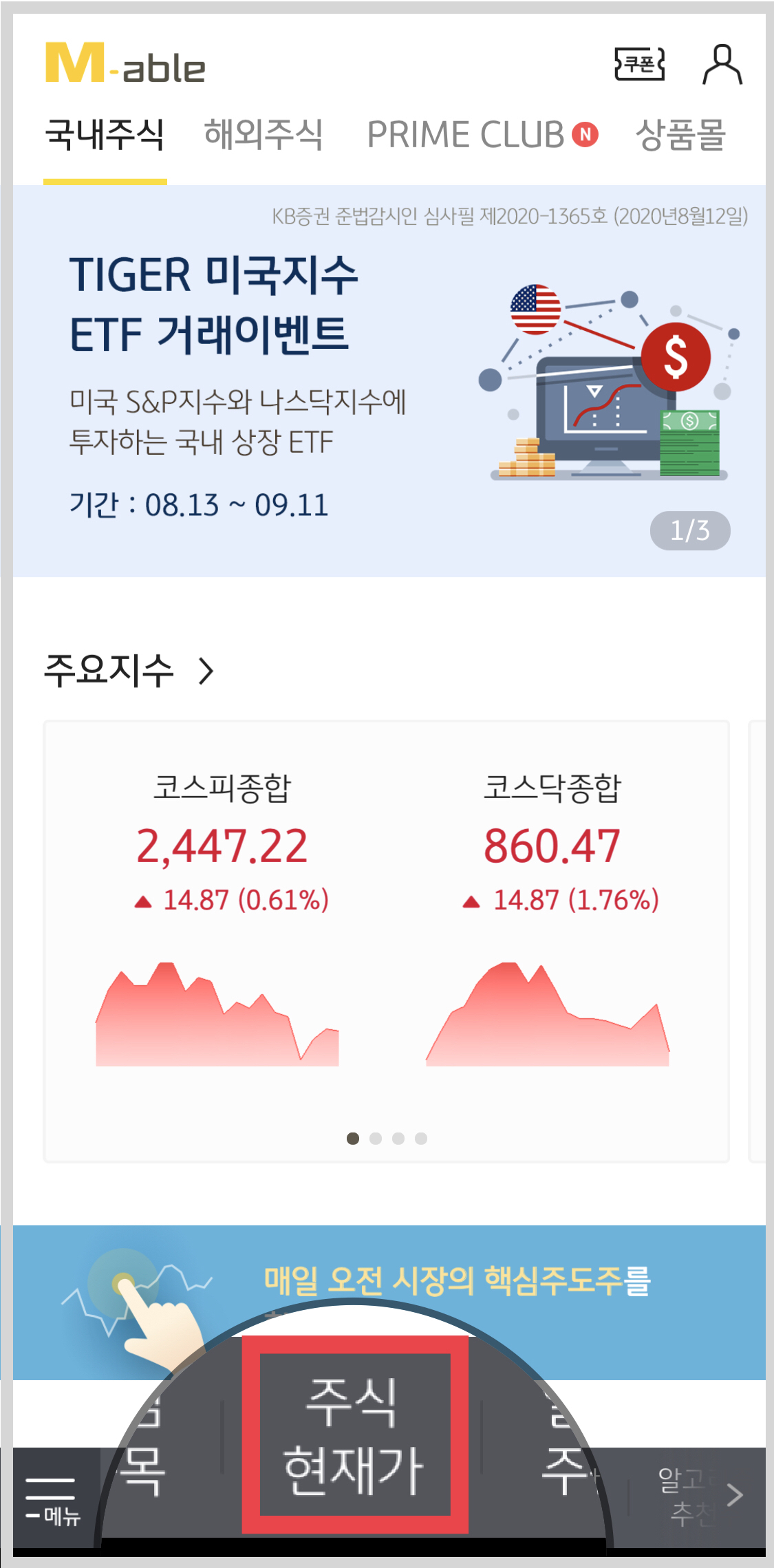 먼저 KB증권 어플인 M-able 에 접속한 뒤, 로그인을 합니다. 그리고 아래와 같이 홈에서 [주식 현재가]를 눌러주세요.