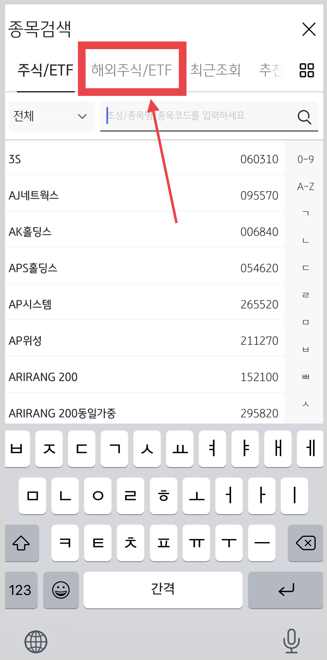 기본적인 종목 검색은 [주식/ETF]로 되어있습니다. 바로 옆에 보면 [해외주식/ETF] 메뉴가 있답니다.