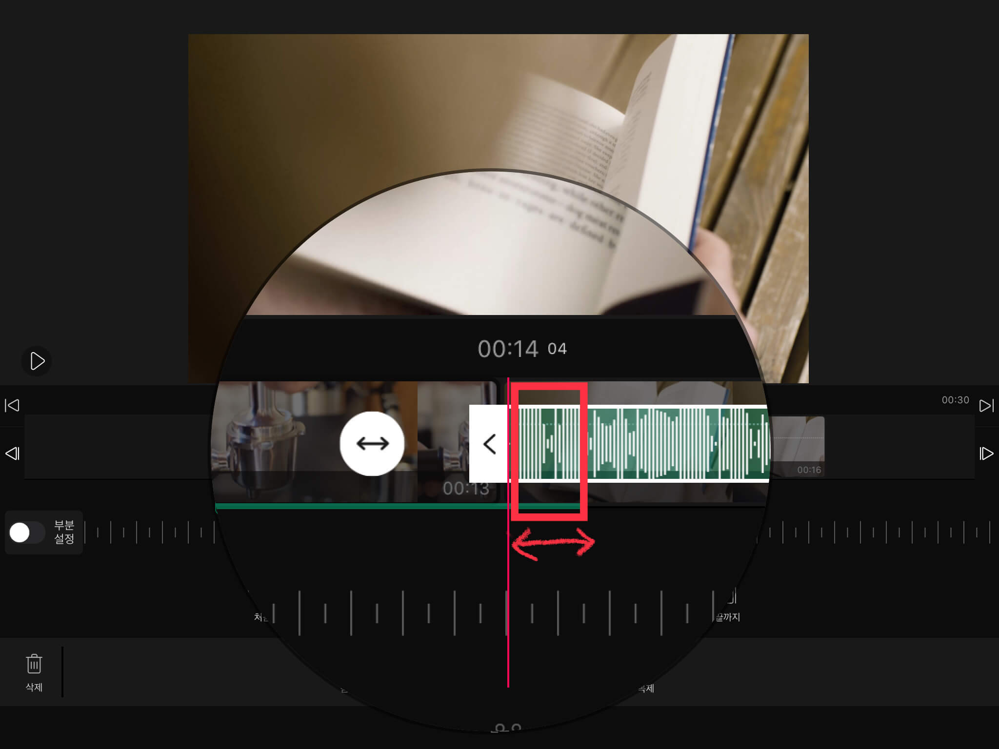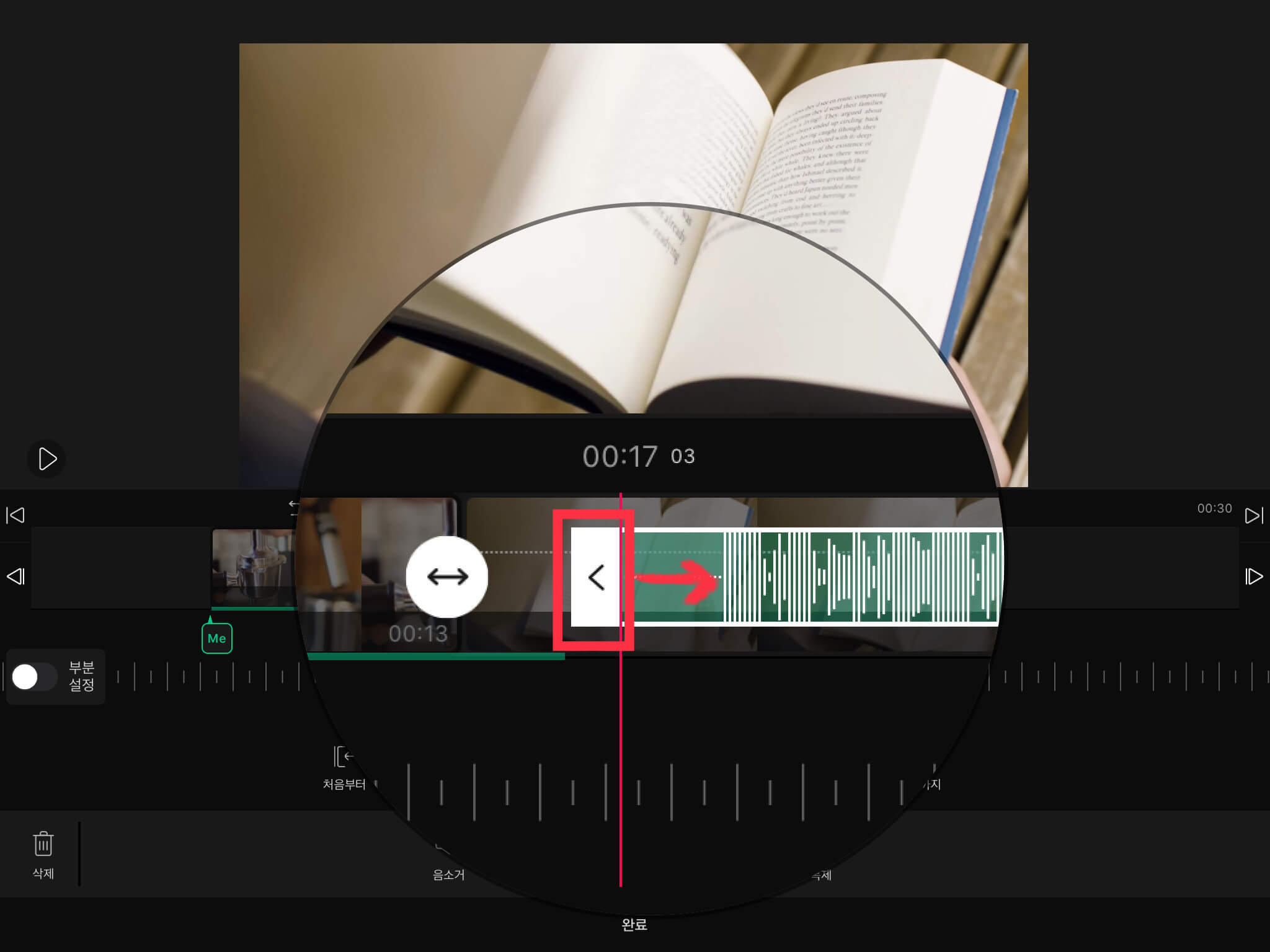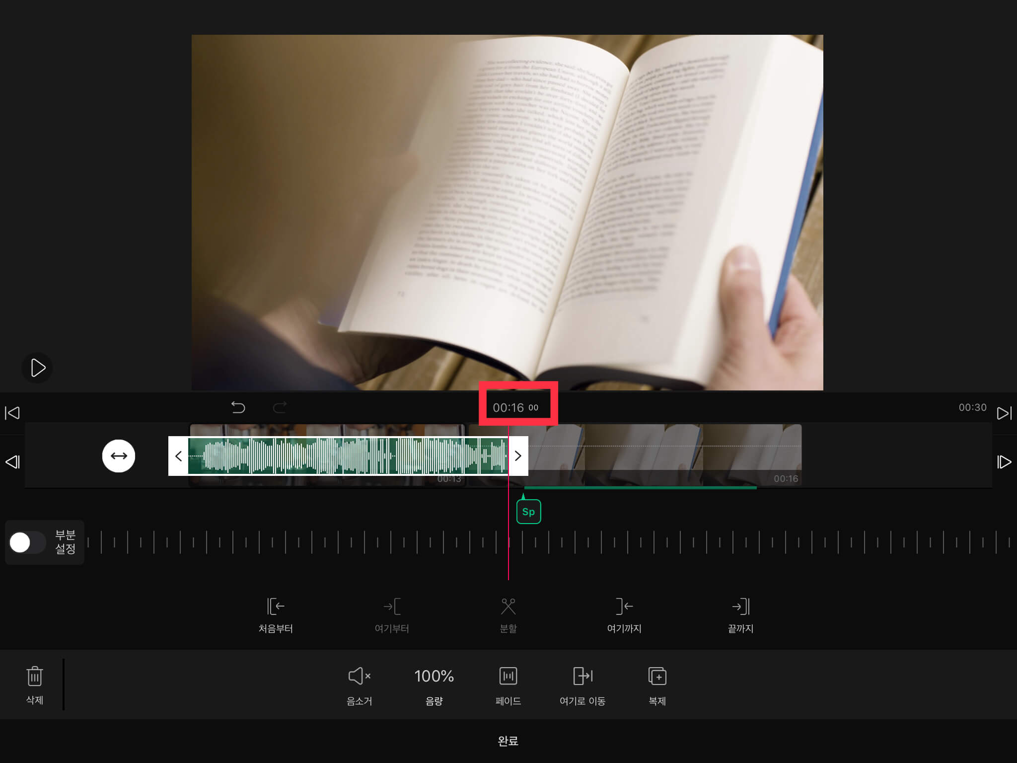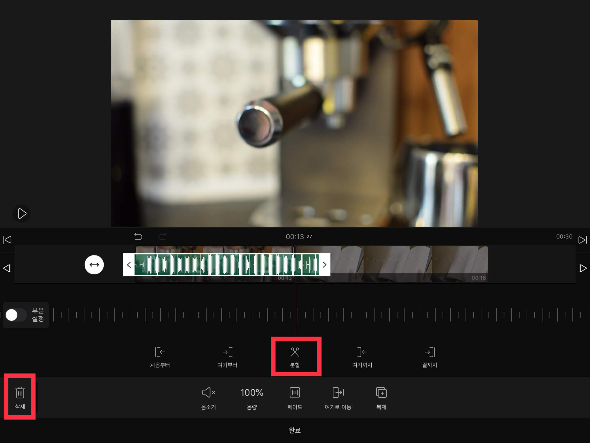 아래와 같이 타임라인에 음악을 넣었습니다. 음악을 자르고 싶을 경우에는 음악파일을 한번 선택하고, [분할]버튼을 눌러 삭제할 부분 선택하여 삭제해주세요.