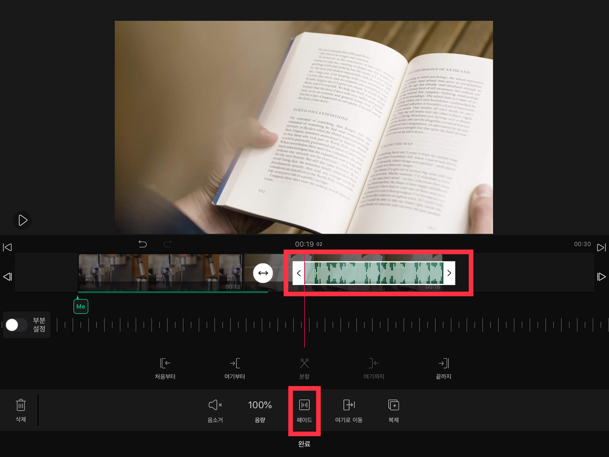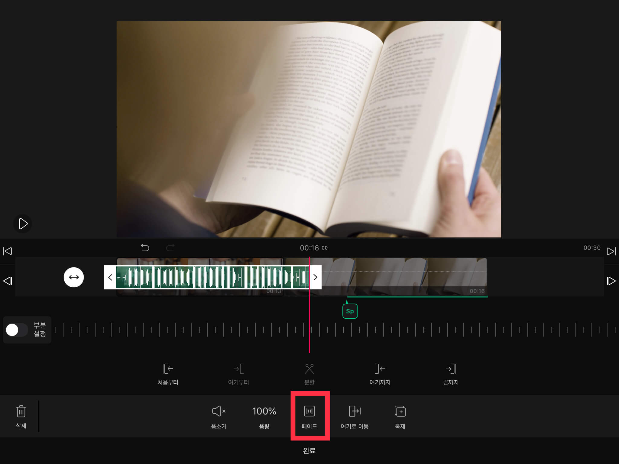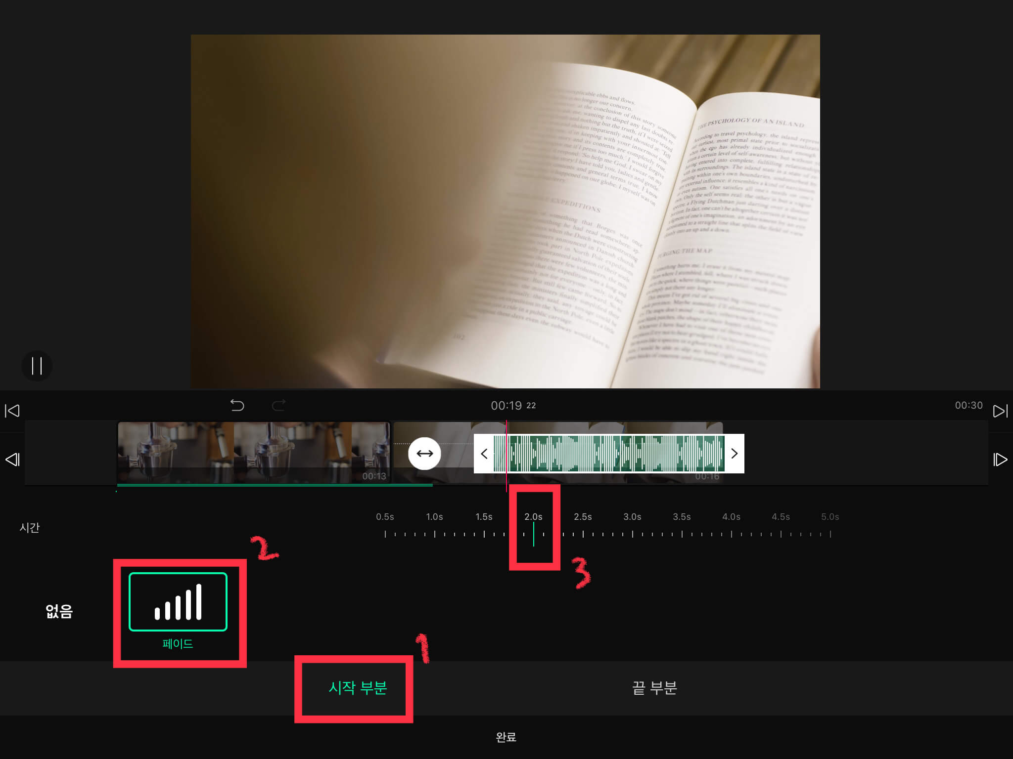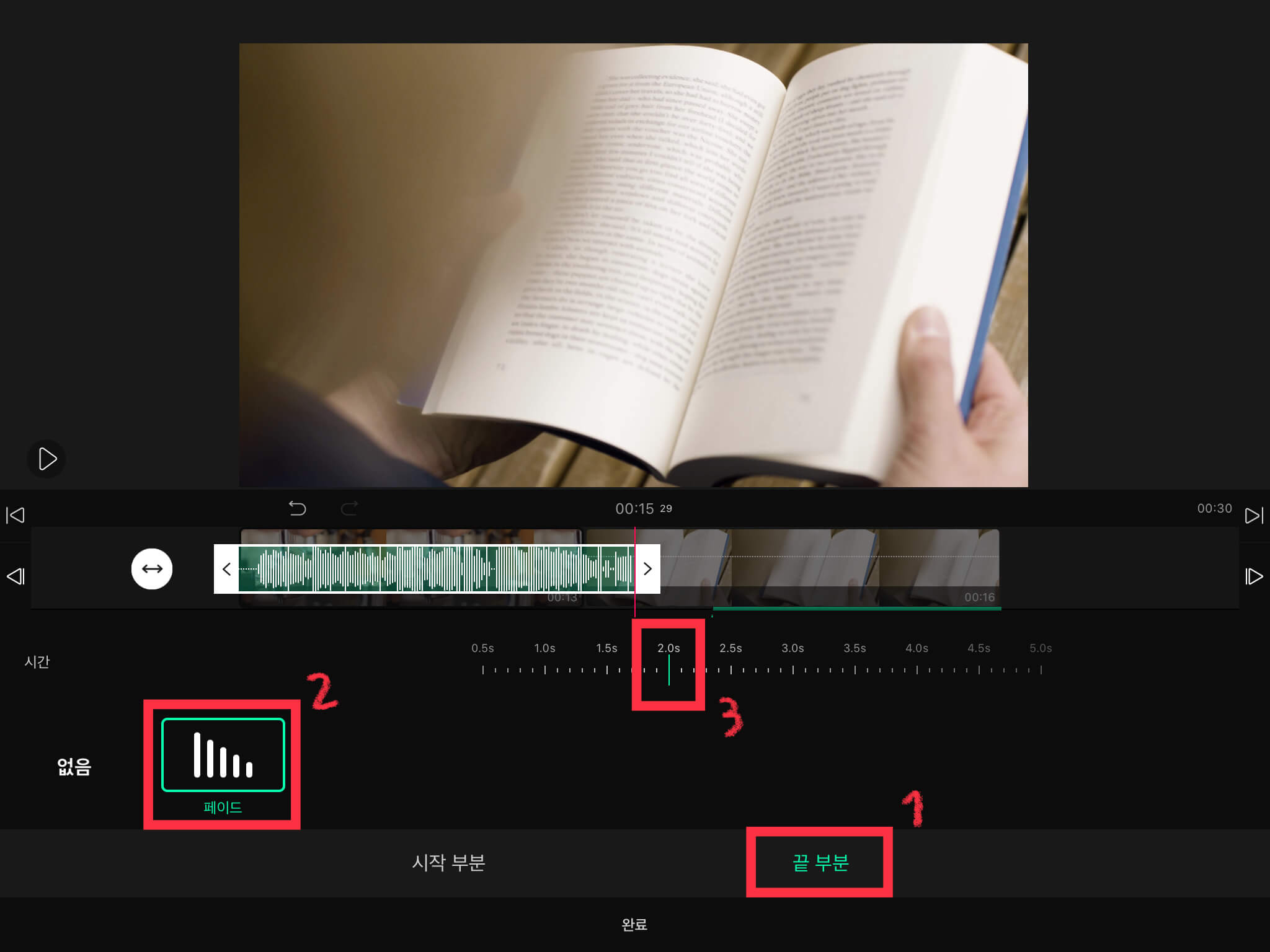 그리고 아래와 같이 [끝부분] - [페이드] - [2.0초]로 설정해줍니다. (초는 자유롭게 설정해주세요)