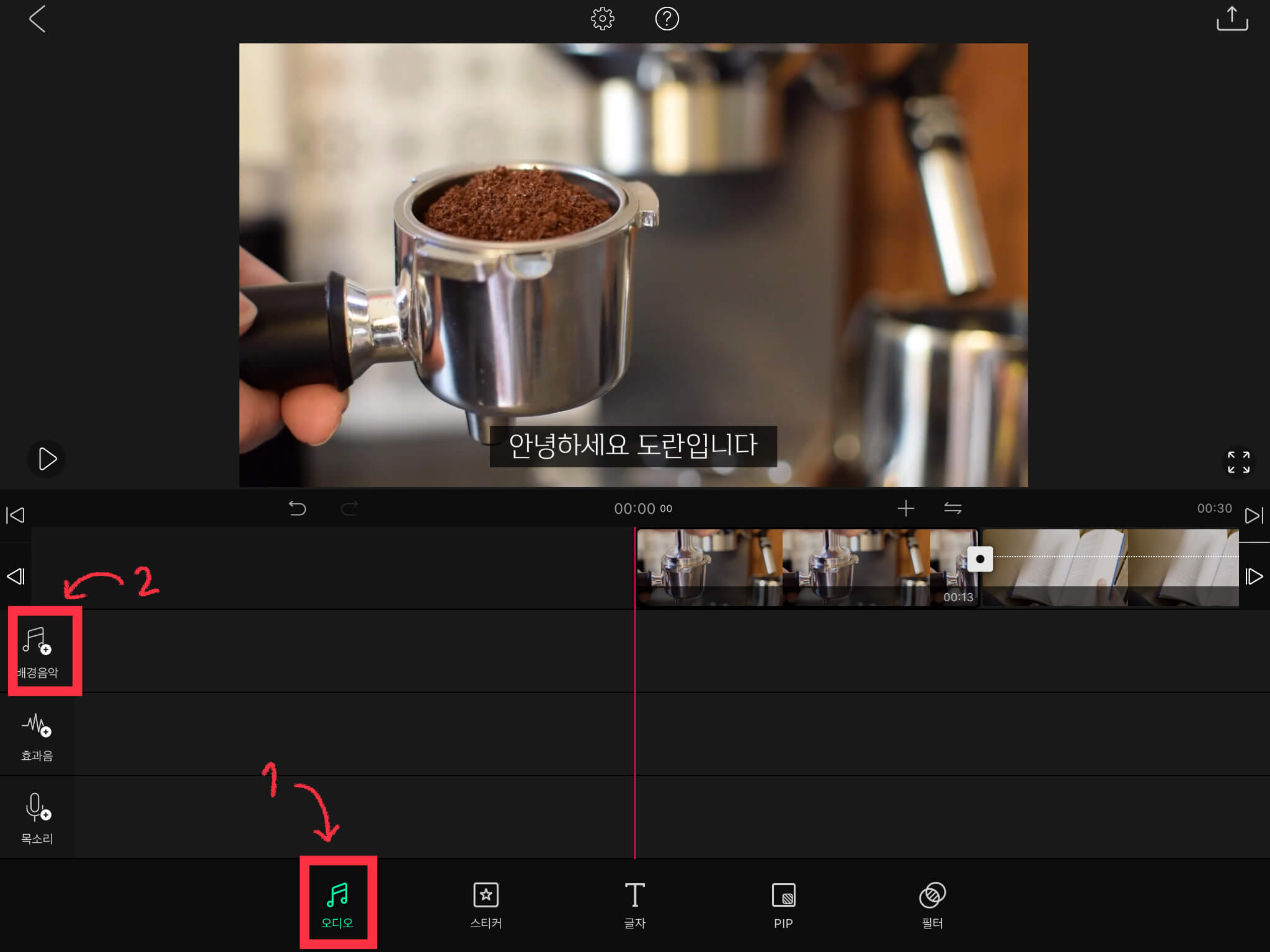 새로운 노래를 넣기 위해서 마찬가지 방법으로, 하단 [오디오] - 왼쪽 [배경음악] 버튼을 눌러 음악을 넣어주세요.
