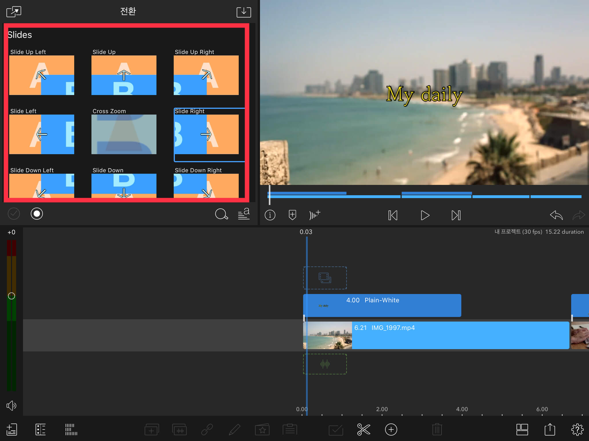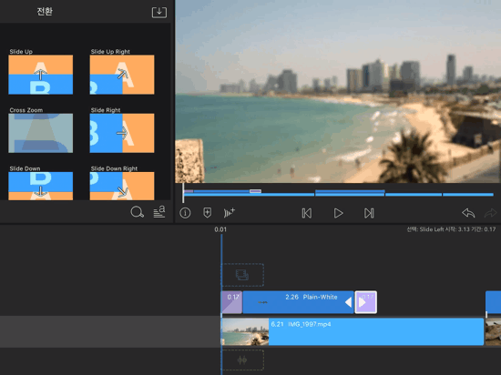 다양한 전환 효과들이 있습니다. 이 곳에서 마음에 드는 효과를 선택합니다. 왼쪽에서 글씨가 들어오는 효과를 주도록 하겠습니다.
