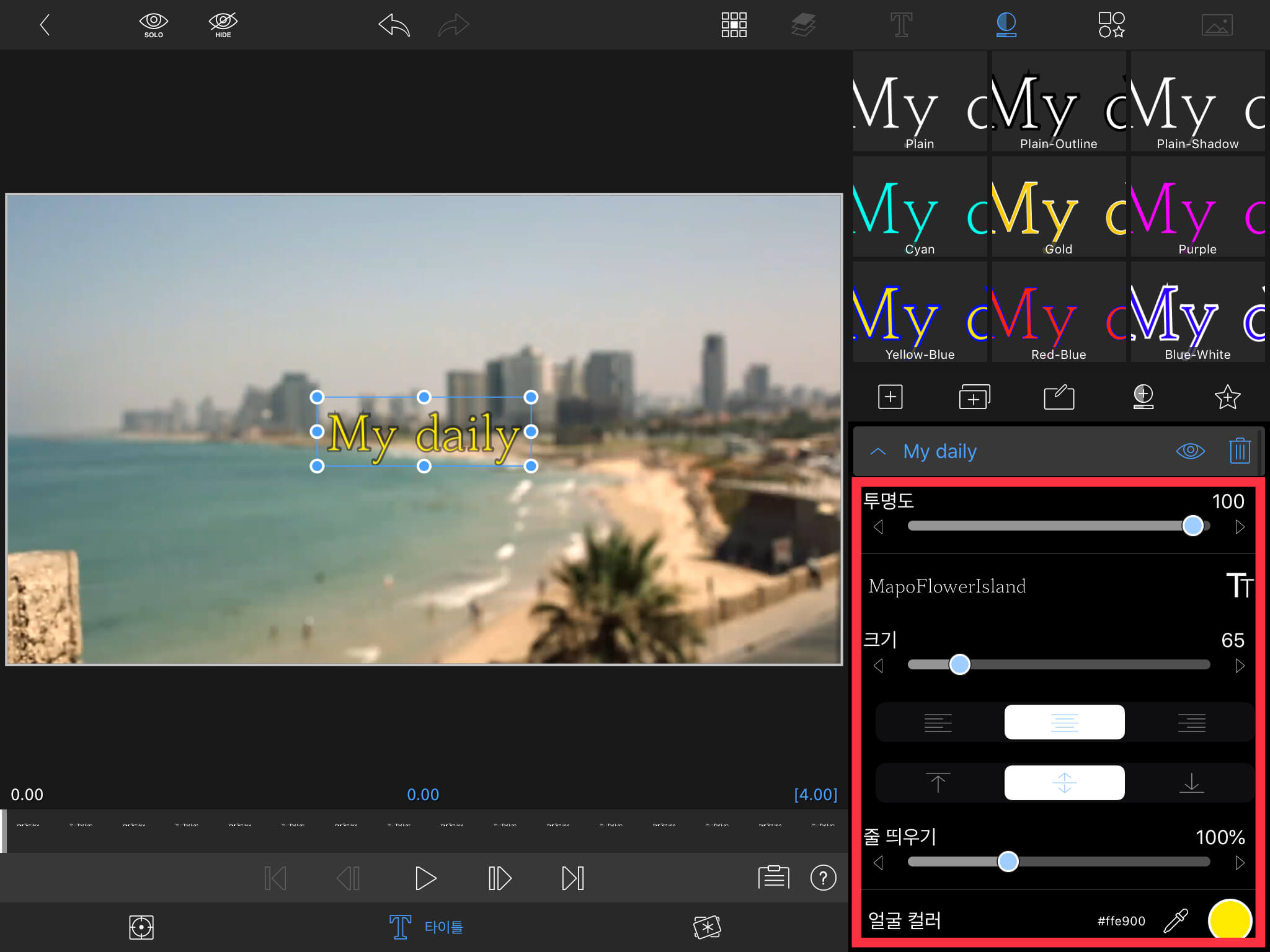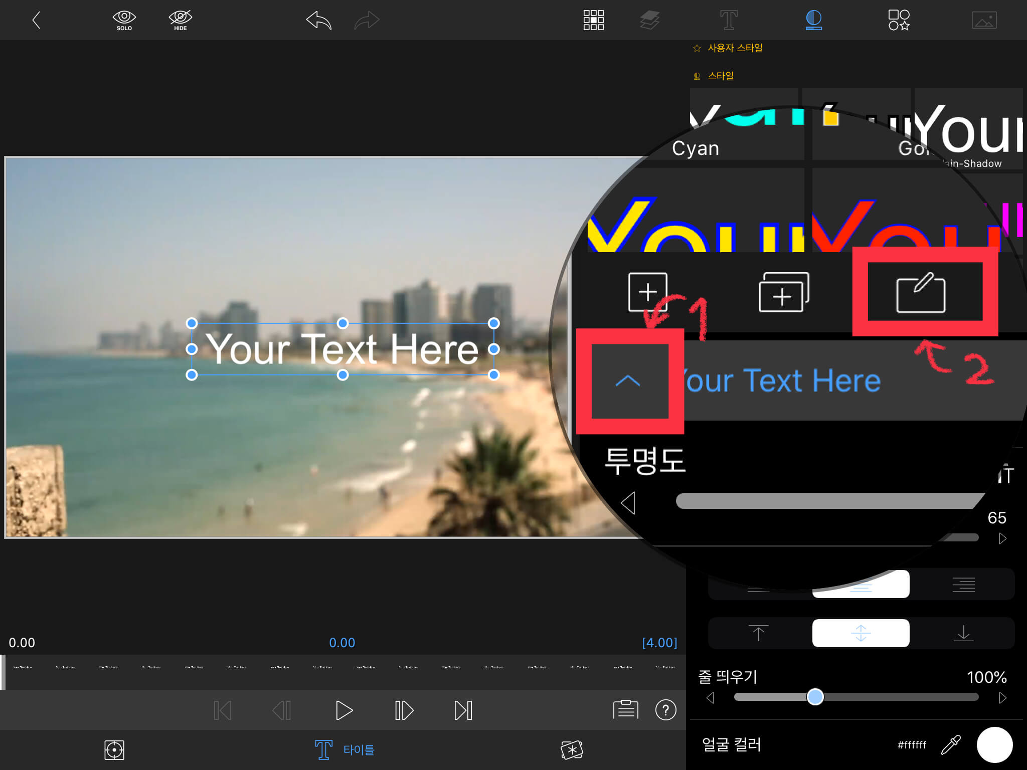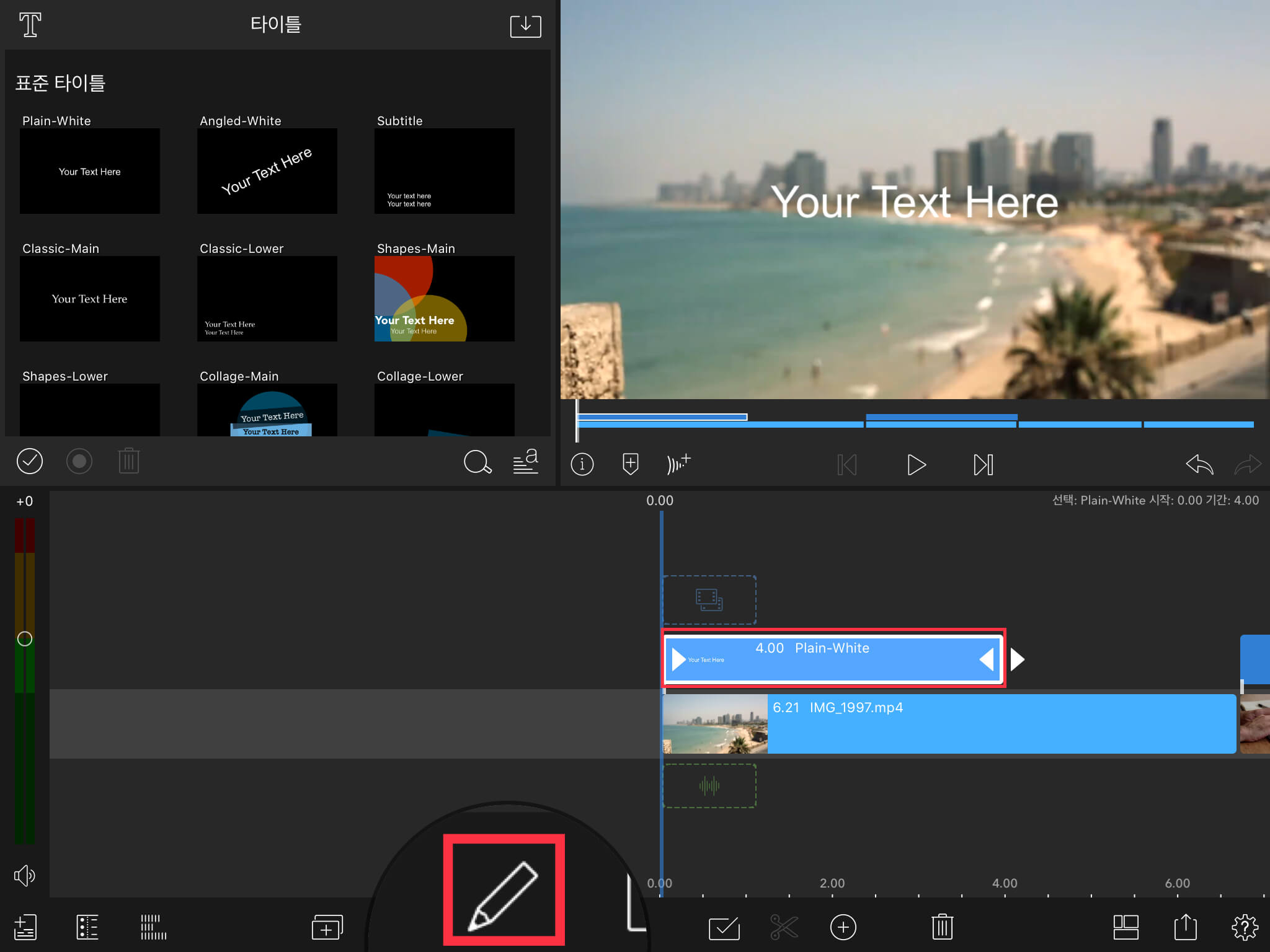 타이틀을 편집하기 위해서 타이틀을 터치한 뒤, 아래 [연필] 버튼을 선택합니다. (타이틀을 두 번 터치해도 됩니다.)
