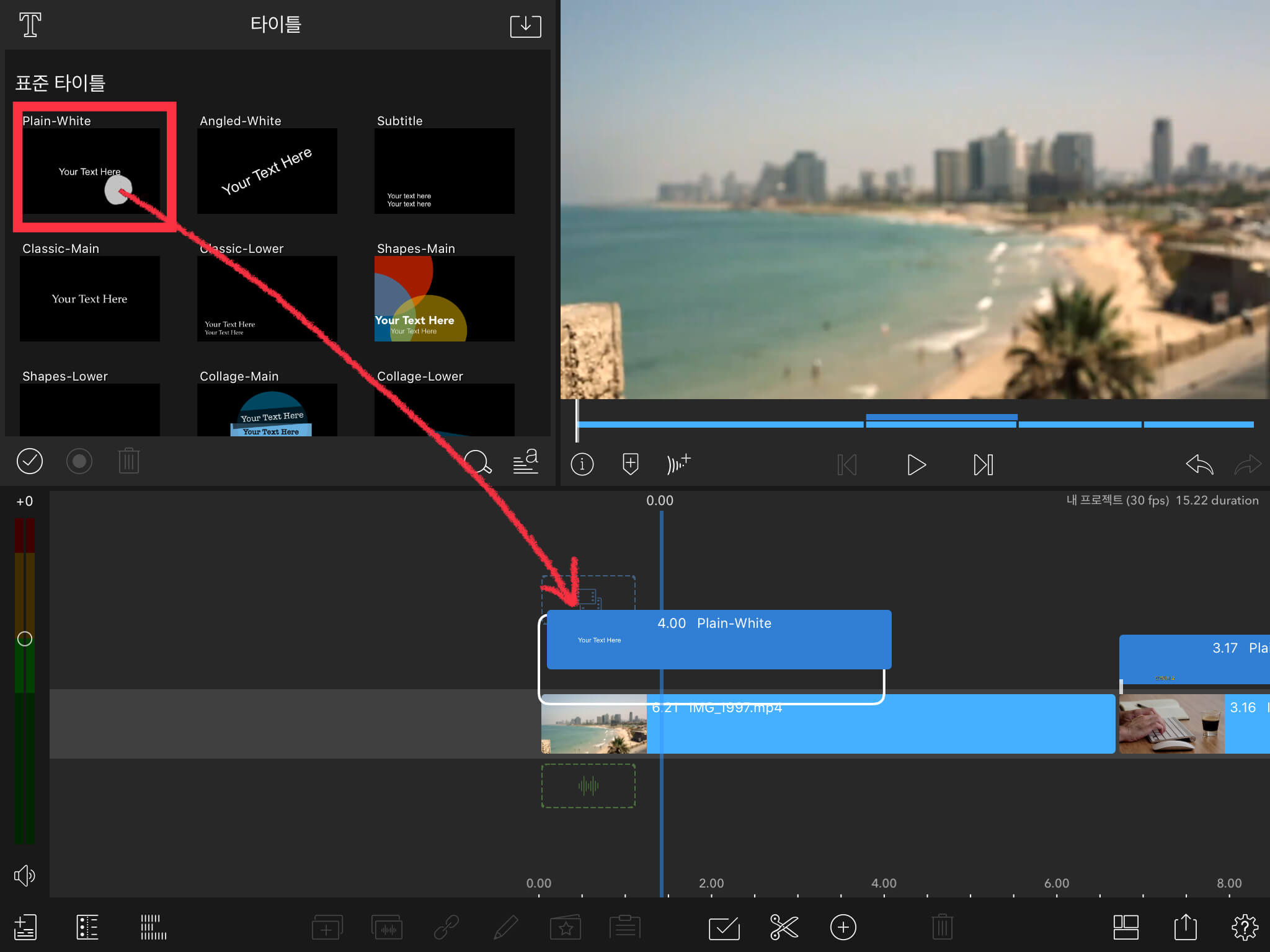 다양한 타이틀 종류가 나오는데요. 가장 기본 자막인 [Plan-White]를 선택합니다. 타임라인으로 끌고 와 주세요.