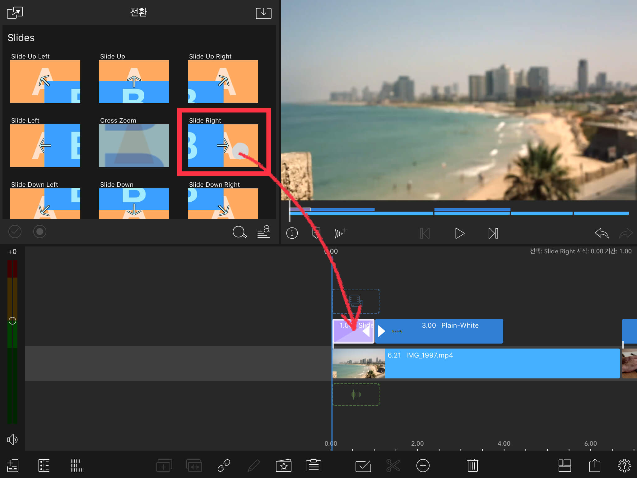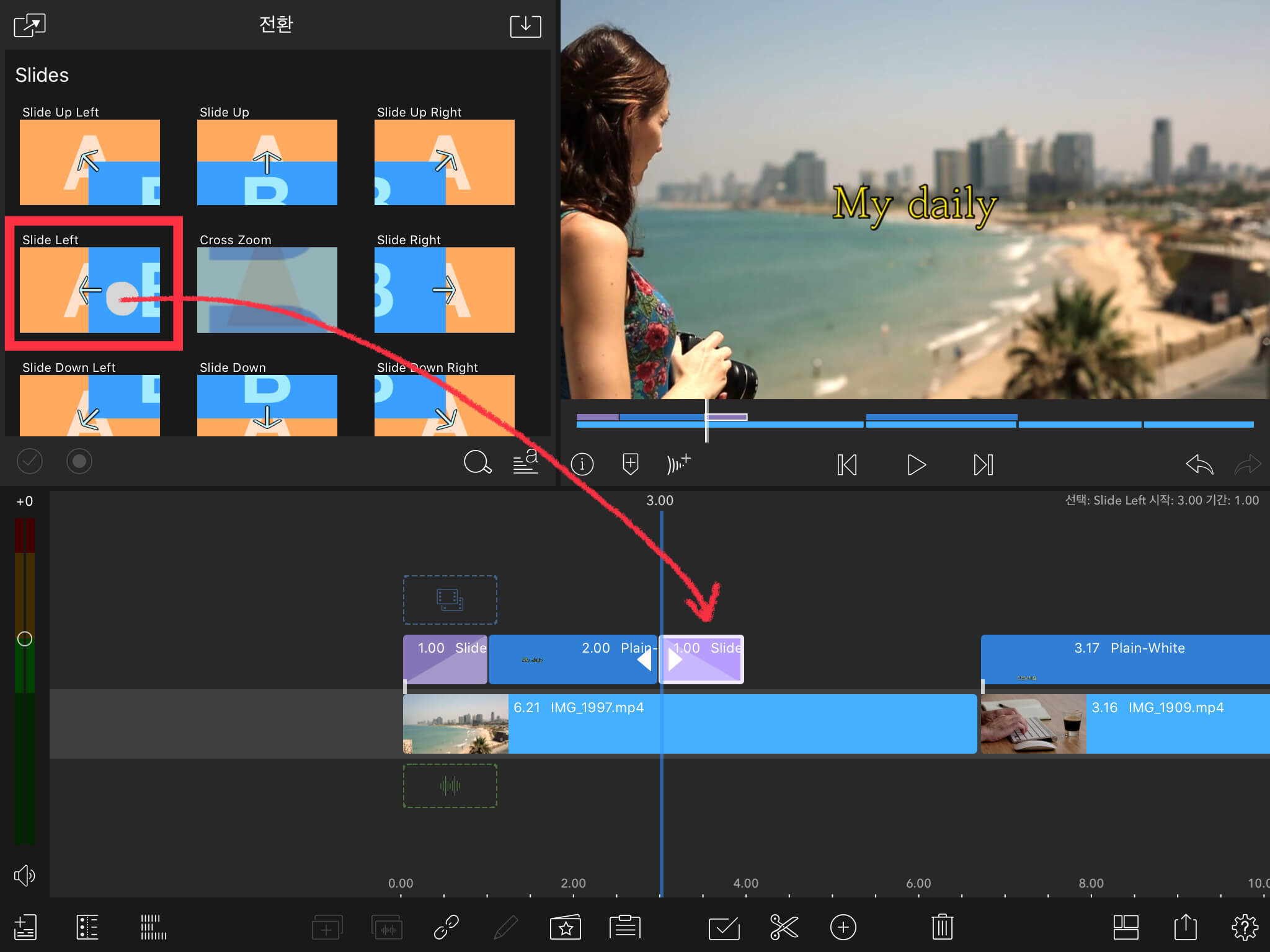 그리고 뒷부분은 반대로 글씨가 사라지는 효과를 주기 위해 [Slide Lefe]를 선택하여 자막의 끝부분에 넣어줍니다.