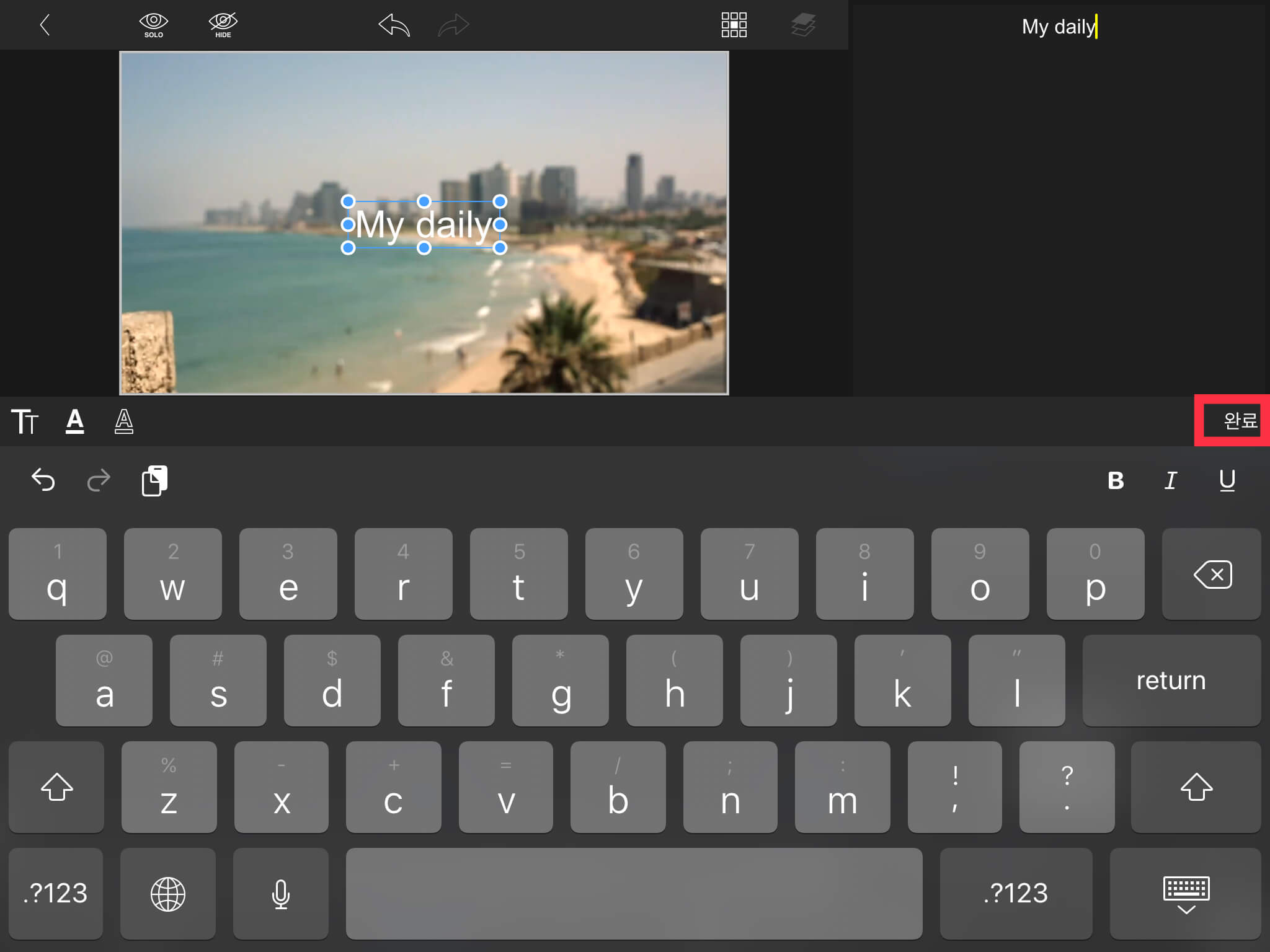 원하는 텍스트를 적어준 뒤에 [완료] 버튼을 누릅니다.
