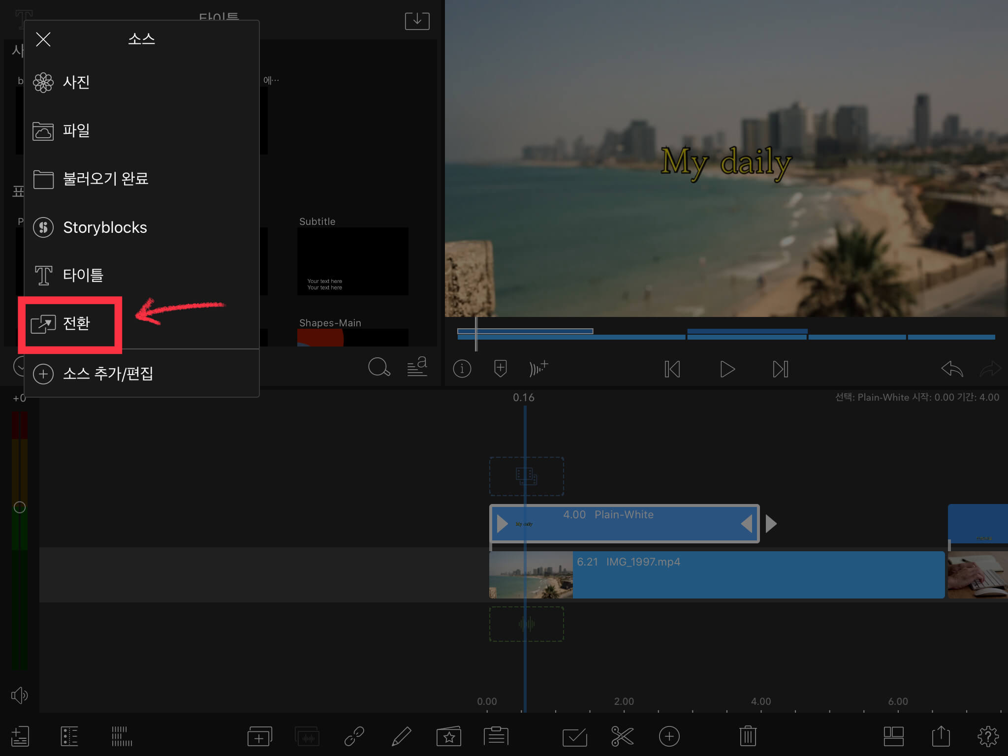 다시 돌아와서 마찬가지고 왼쪽 상단의[소스] 버튼을 눌러줍니다. 이번에는 [전환] 메뉴를 선택합니다.