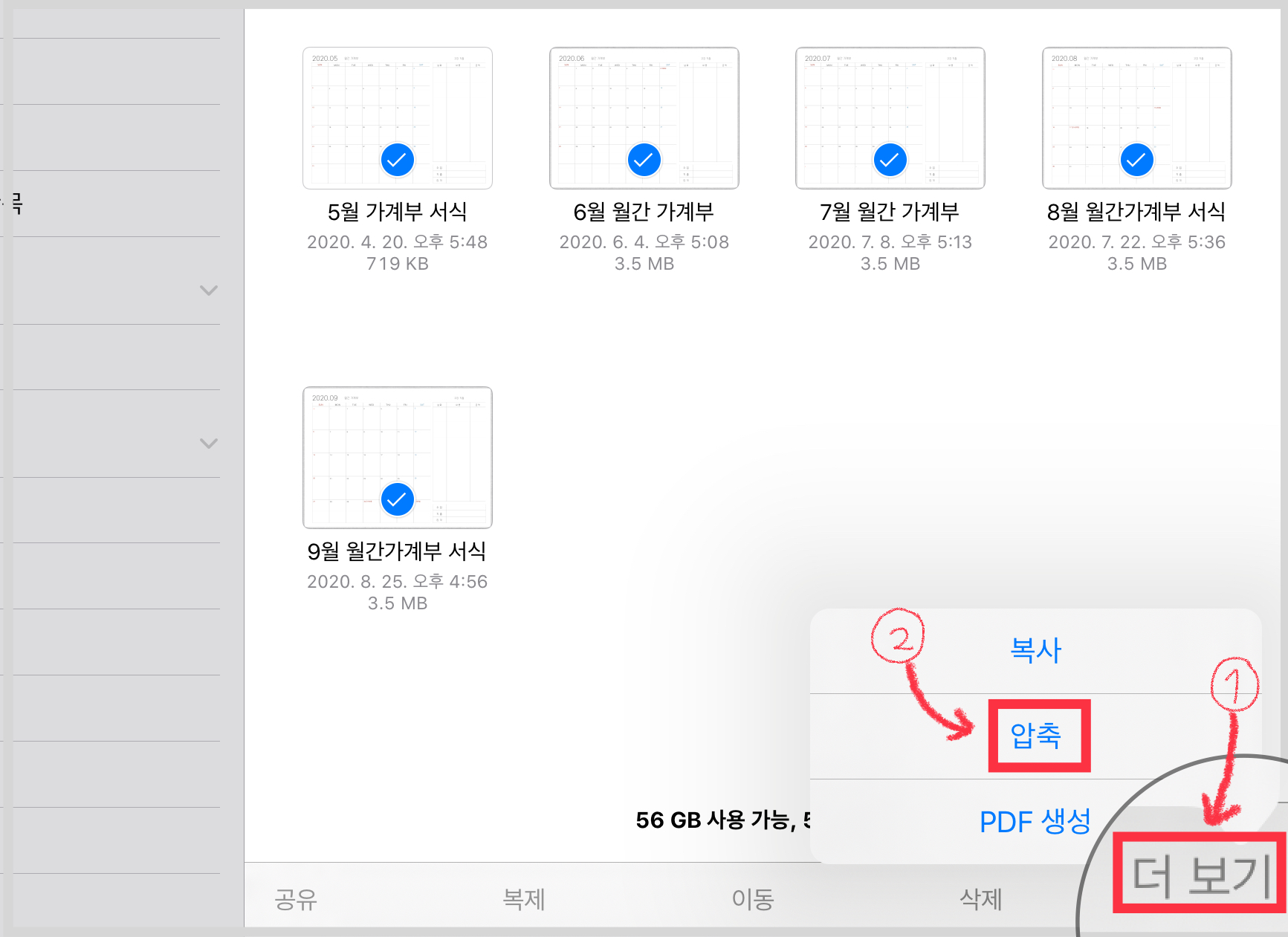 ▼ 선택을 한 뒤에 오른쪽 아래에 있는 [더보기] 버튼을 눌러주세요. 그리고 복사, 압축, PDF 생성 메뉴 중에 [압축] 메뉴를 선택합니다.