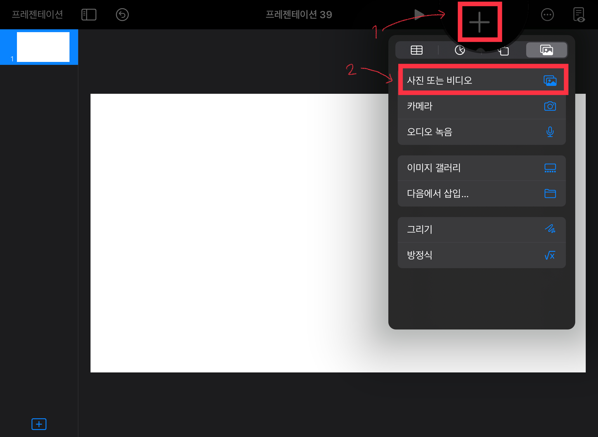 ▼ 오른쪽 상단에 있는 + 버튼을 눌러서 이미지를 불러옵니다. [사진 또는 비디오]를 눌러주세요.