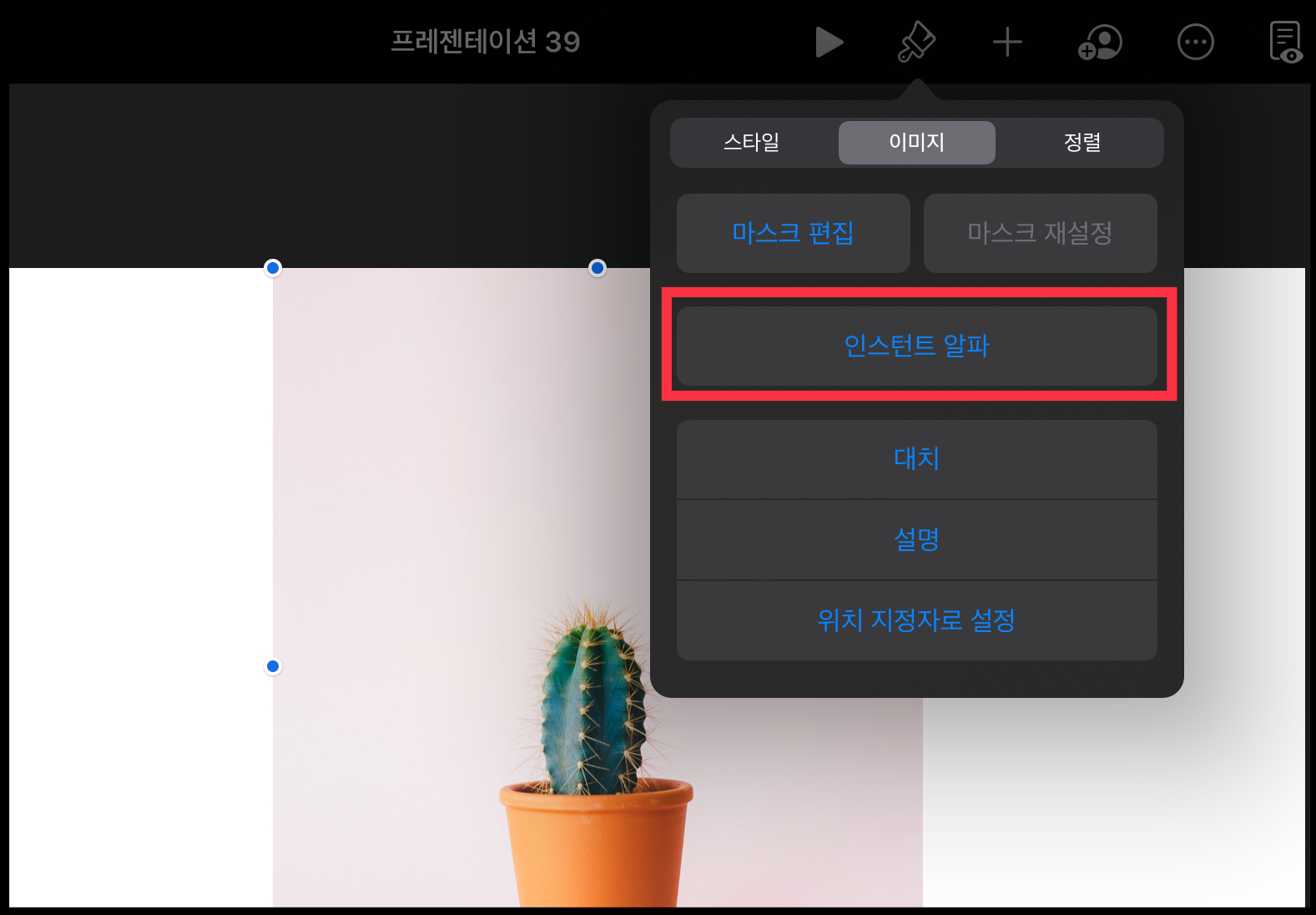 ▼ [이미지] - [인스턴트 알파] 메뉴를 차례대로 선택합니다.