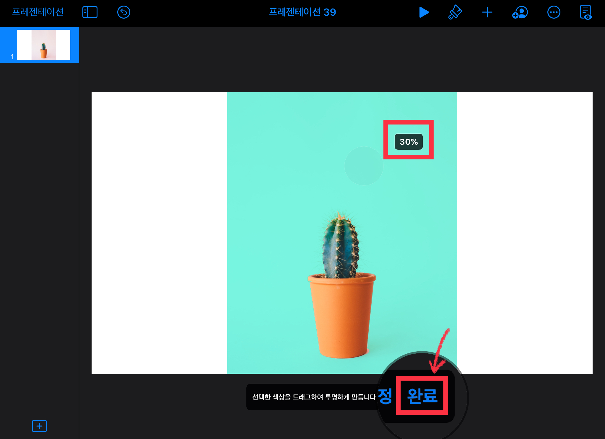 ▼ 저는 30% 정도의 투명도를 주었어요. 민트 색상으로 변하는 부분이 투명하게 될 부분입니다. [완료] 버튼을 눌러주세요.