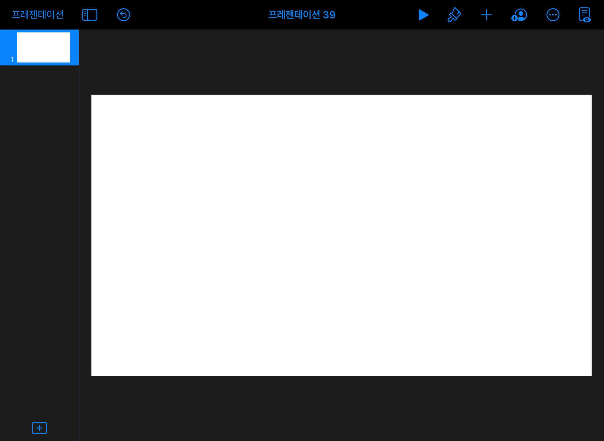 ▼ 먼저 아이패드에서 키노트 어플을 실행해주세요. 그리고 + 버튼을 눌러 아래와 같이 새로운 프레젠테이션을 만들어 주세요.(텍스트 박스는 터치하여 삭제를 눌러주세요)